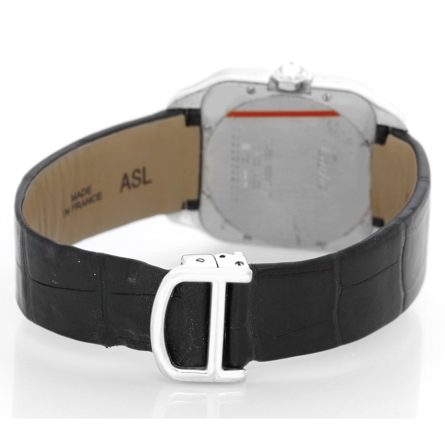 Cartier Santos Dumont 18k White Gold & Diamond Men's/Ladies Watch WH100251 - Quartz. 18k white gold case with full factory diamond bezel. Ivory colored dial with black Roman numerals. Black croc Cartier strap band with 18k white gold deployant clasp. Pre-owned with box and papers.