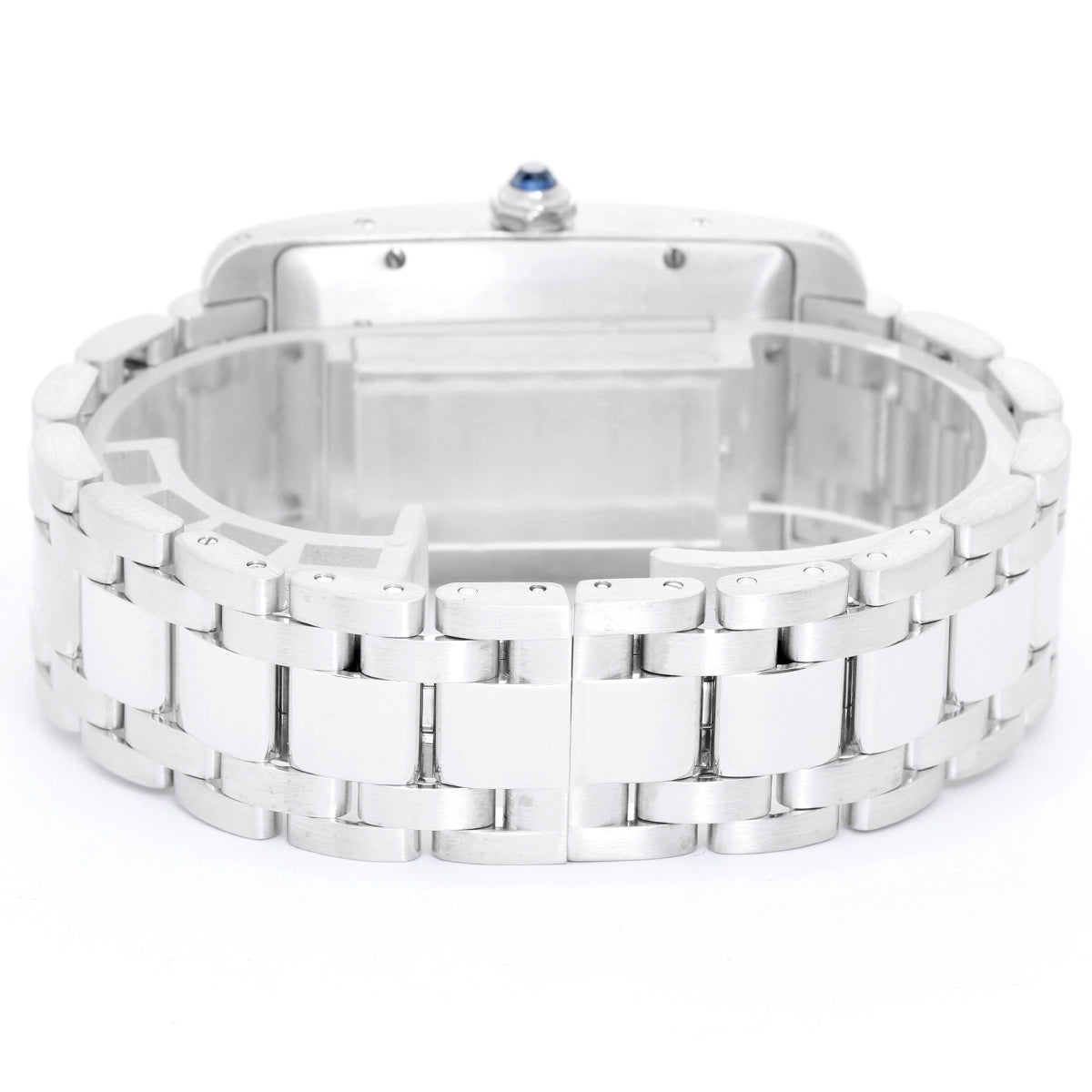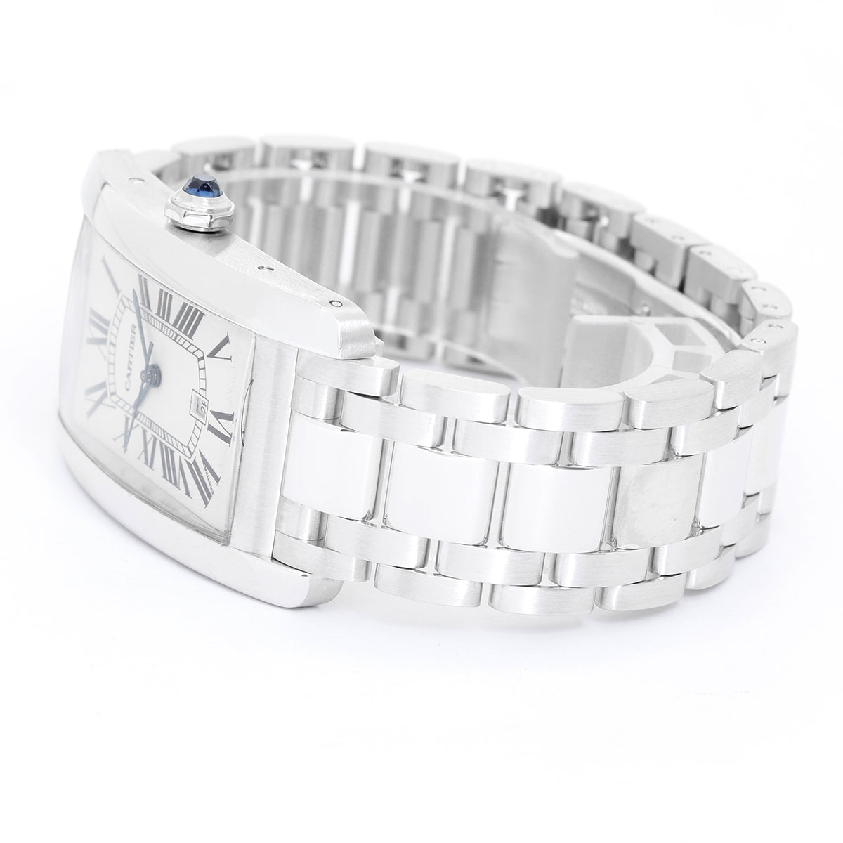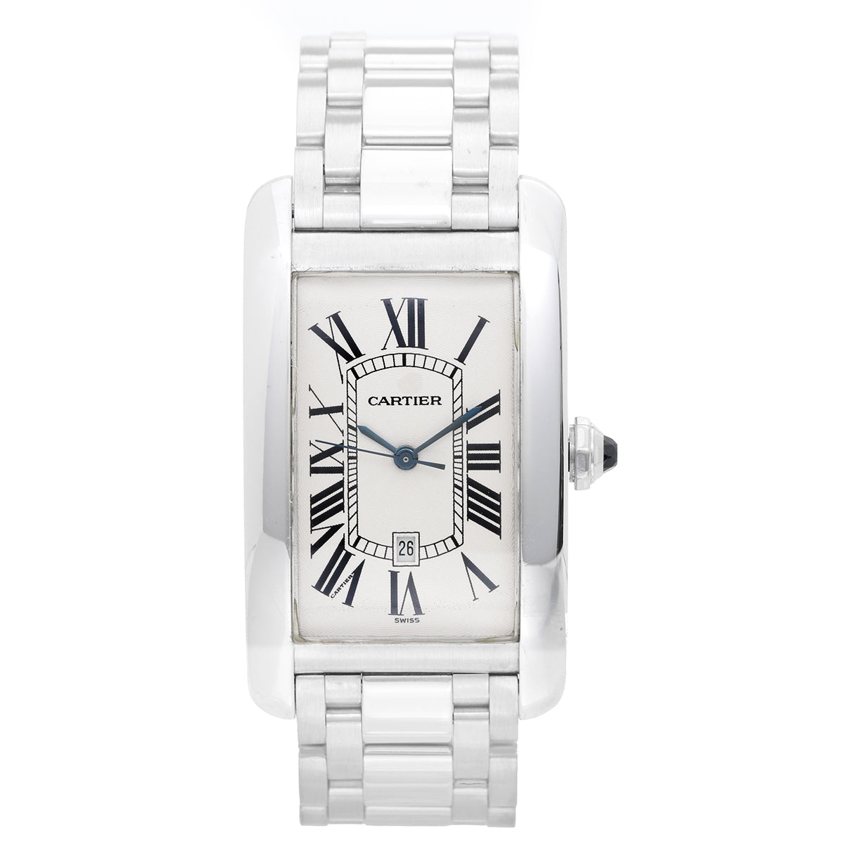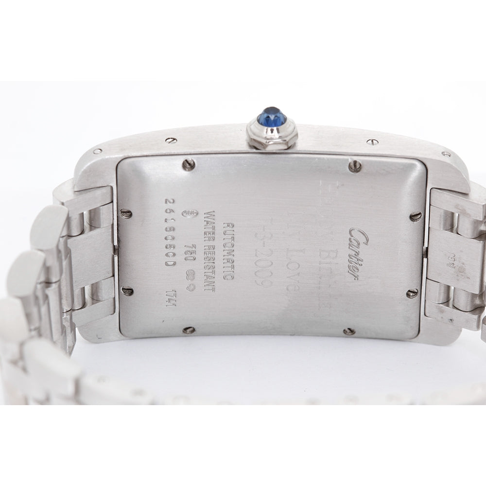 Cartier Tank Americaine 18K White Gold W26055L1 - Automatic winding. 18K White Gold ( 26 x 44 mm ). Silver guilloche dial with black Roman numerals; Date at 6:00 o' clock. 18K White Gold Cartier bracelet with deployant clasp. Pre-owned with Cartier box.