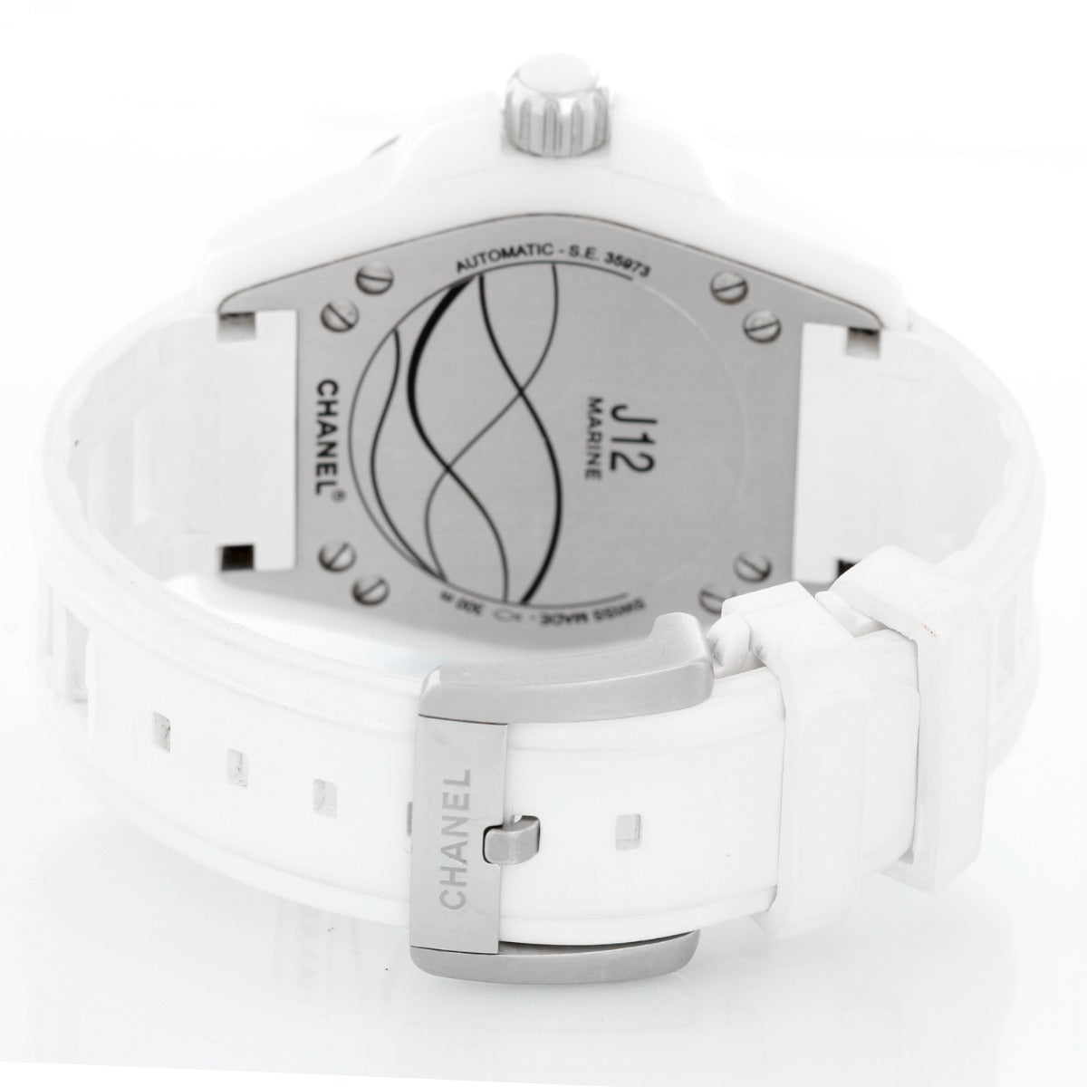 Chanel J12 Marine Ladies Ceramic Watch H2560 - Automatic winding with date. White ceramic case; stainless steel bezel with white bezel insert (38mm diameter). White dial with luminous style markers. White rubber strap with tang buckle. Pre-owned with custom box.