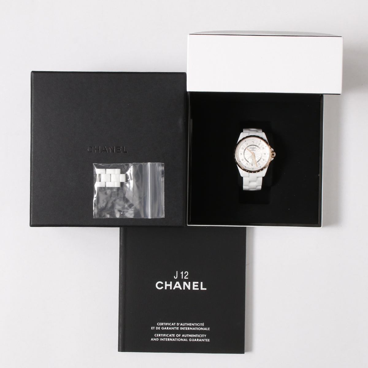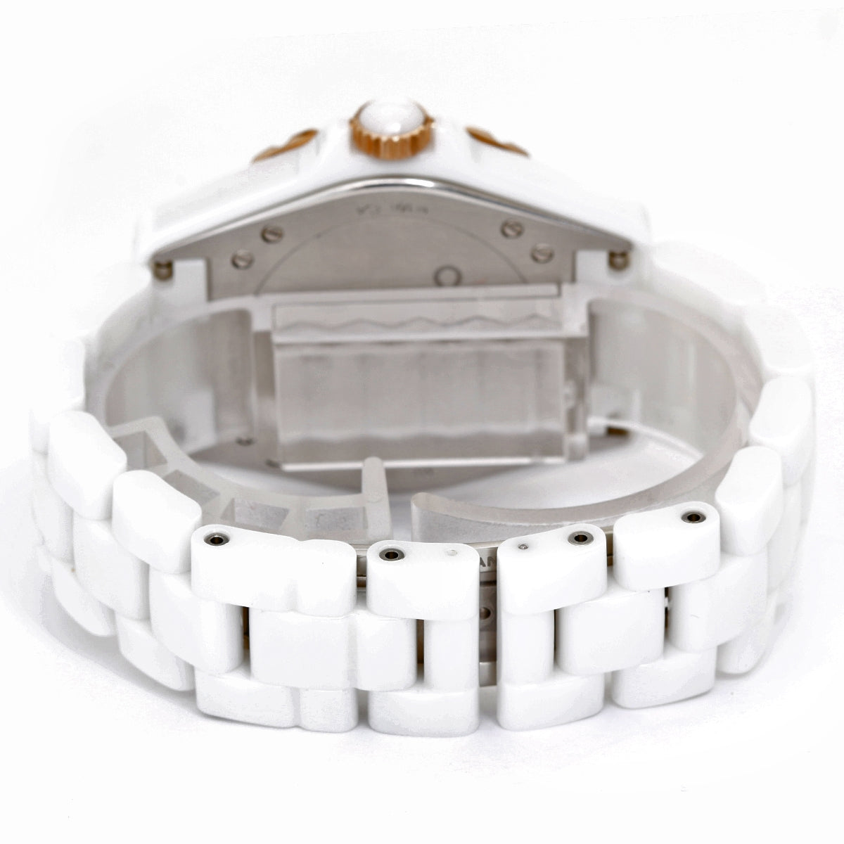 Chanel J12 White Ceramic Watch H4359 - Automatic movement. White ceramic case with 18k rose bezel (36.5 mm) (36.5mm). Opaline guilloché dial with 11 diamond hour markers. White ceramic bracelet with double deployant clasp. Unused with Chanel box and papers.
