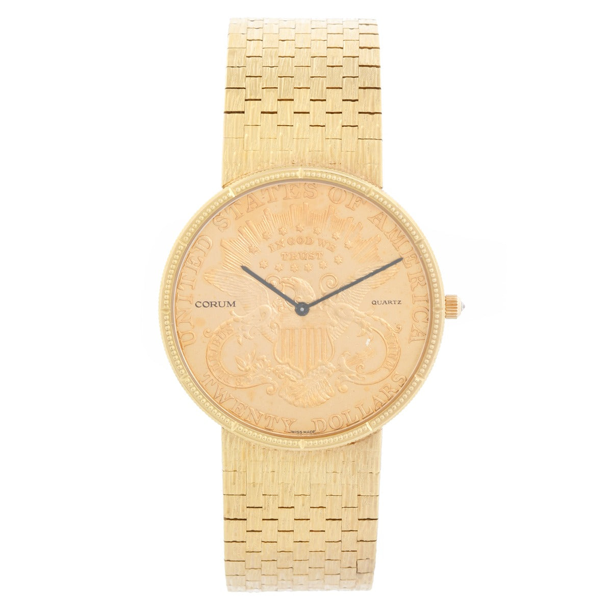 Corum $20 18k Liberty Gold Coin Men's 1902 Quartz Watch - Quartz movement. 18k yellow gold case made from a U.S. Twenty Dollar 1902 Liberty Coin ( 35 mm ) . 1902 U.S. $20 Liberty Gold Coin. 18K Yellow gold link bracelet; will fit up to a 7 1/2 inch wrist. Pre-owned with custom box.
