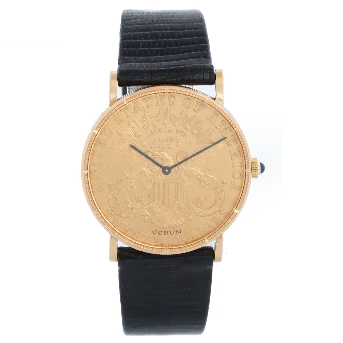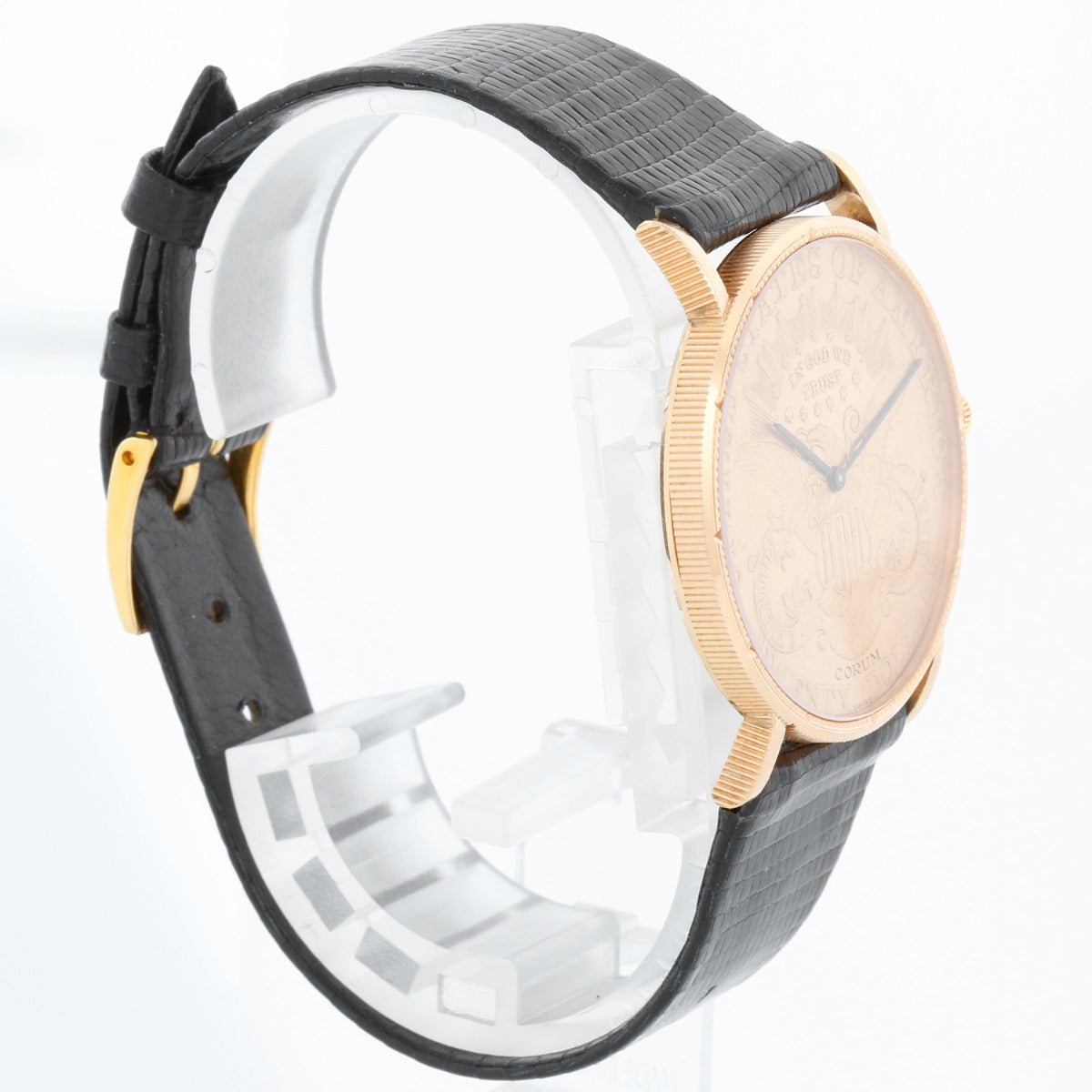 Corum $20 18k Liberty Gold Coin Men's 1904 Quartz Watch - Quartz movement. 22k yellow gold case with Liberty Double Eagle U.S. Twenty Dollar Liberty Coin (36mm diameter). 1904 U.S. $20 Liberty Gold Coin. Corum black strap and Corum buckle. Pre-owned with custom box.