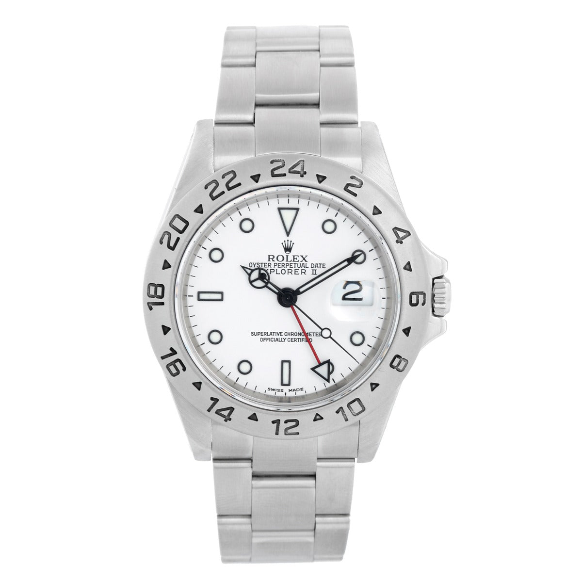 Rolex Explorer II Men's Stainless Steel Watch 16570 - Automatic winding, 31 jewels, Quickset, sapphire crystal, dual time. Stainless steel case (40mm diameter). White dial with luminous markers. Stainless steel Oyster bracelet . Pre-owned custom box.