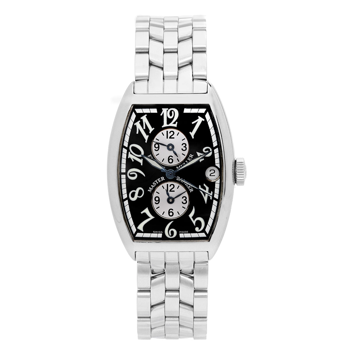 Franck Muller Master Banker Men's Watch Ref 5850 MB - Automatic winding; Sapphire crystal. Stainless Steel tonneau case ( 32 x 45 mm ). Black dial with luminous Arabic numerals. 2 silver suddials for two other time zones; date at 3 o' clock. Stainless steel with clasp buckle. Pre-owned with box and papers.