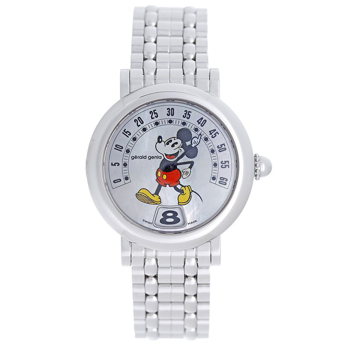 Gerald Genta Retro Fantasy Disney Mickey Mouse Stainless Steel 34mm Automatic Watch - Automatic winding. Stainless steel coin edge case (34mm diameter). Mother of pearl dial with Mickey Mouse image; jumping hour aperture at 6 o'clock; black Arabic minutes. Stainless steel Gerald Genta bracelet (will fit apx. 6-3/4-inch wrist). Pre-owned with custom box.