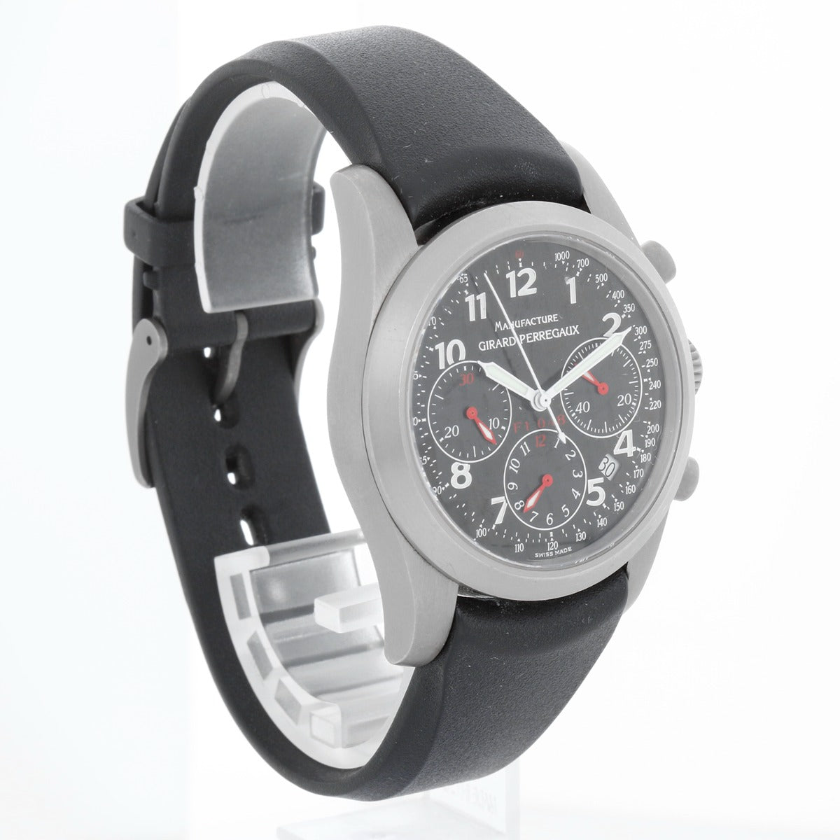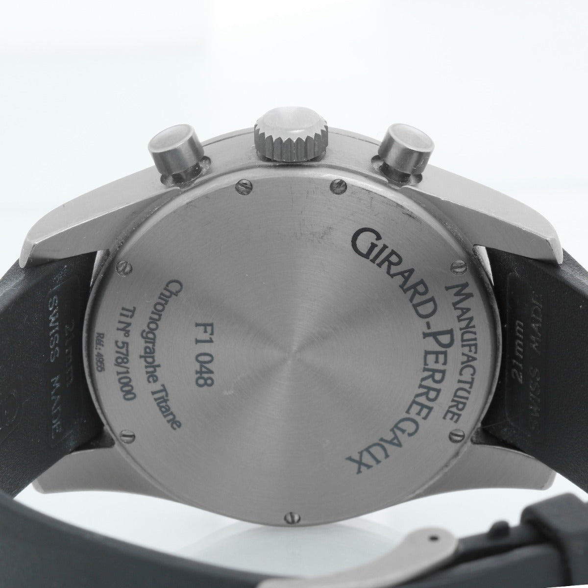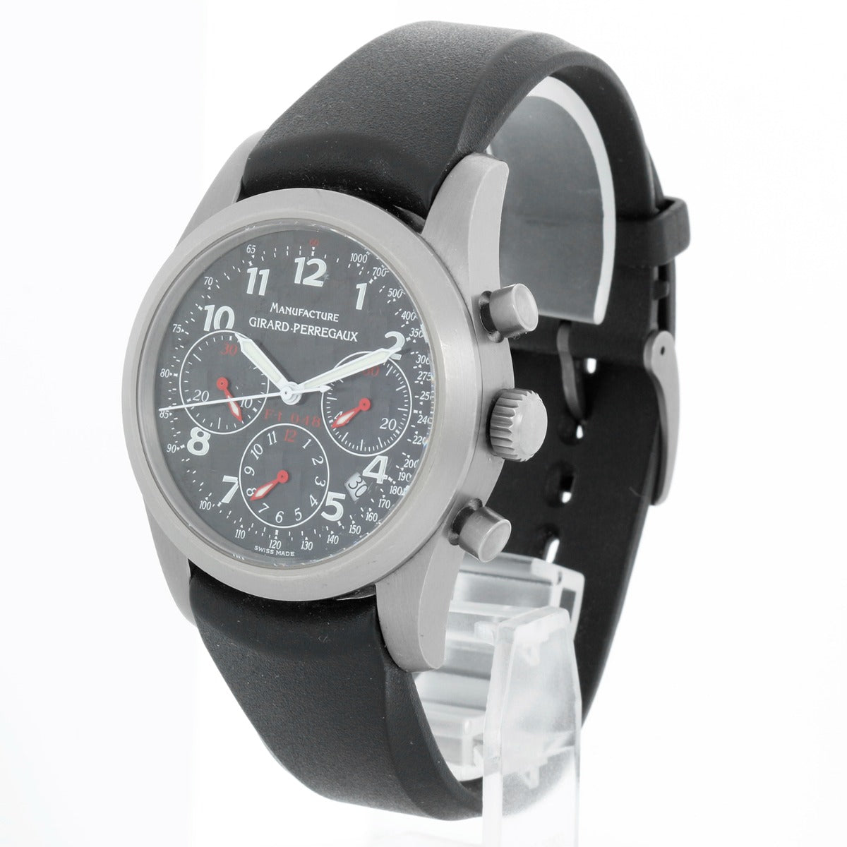 Girard Perregaux Ferrari F1 048 Men's Titanium Watch 4955 - Automatic winding, chronograph. Titanium case (40mm diameter) Original finish . Black Carbon Fiber dial with Arabic numerals, date between the 4 & 5 o'clock position. Girard-Perregaux black rubber strap with titanium buckle. Pre-owned with Girard-Perregaux box and papers. Open papers.