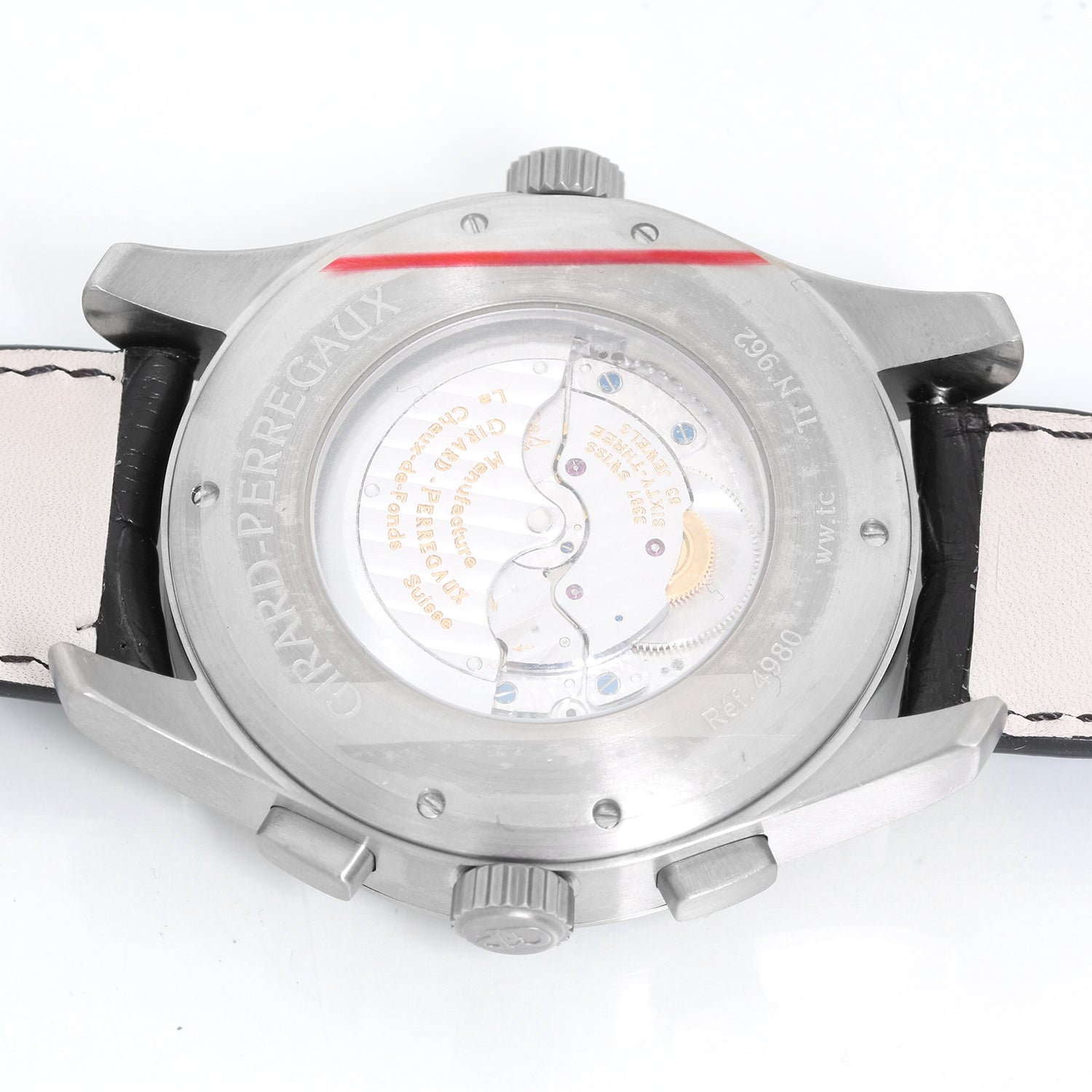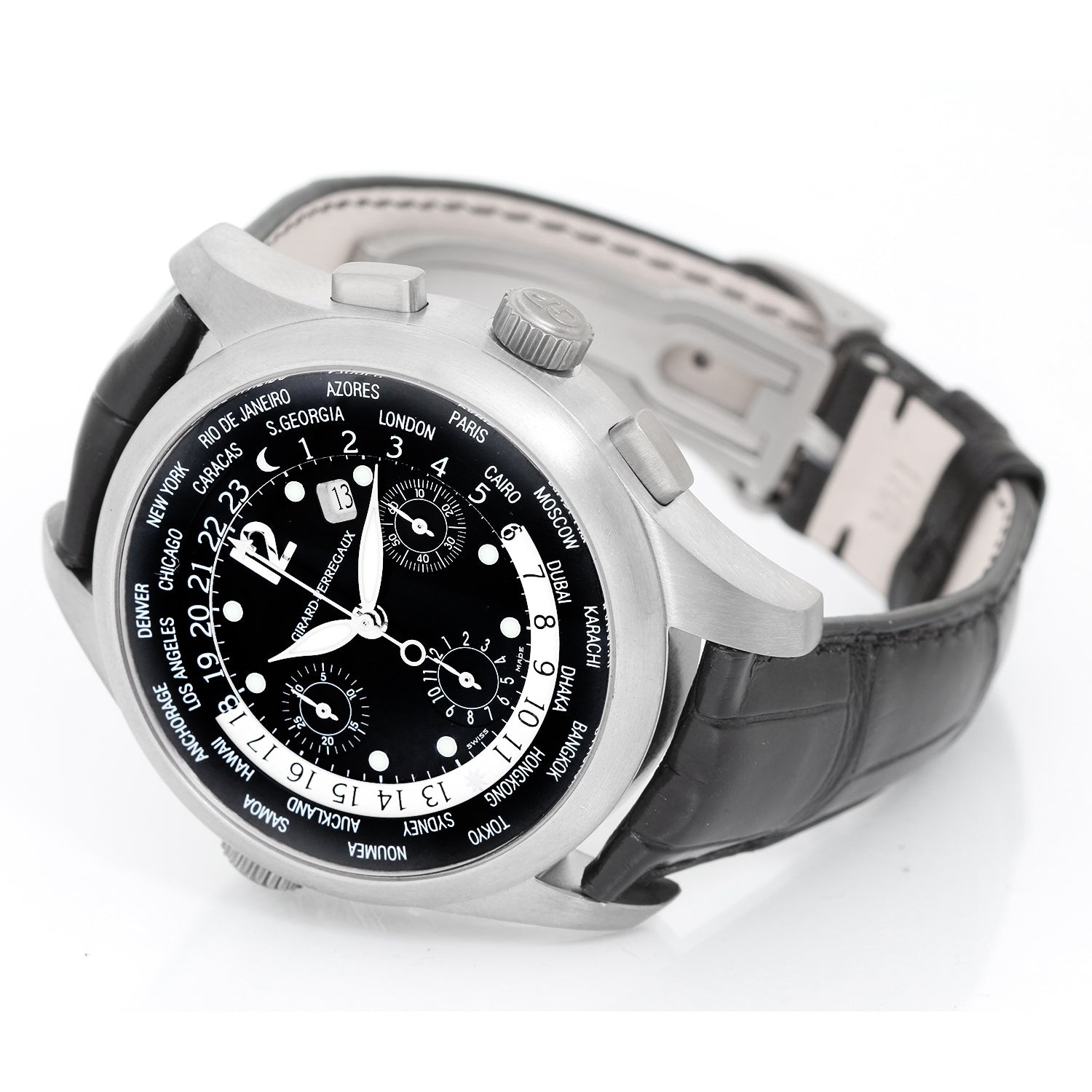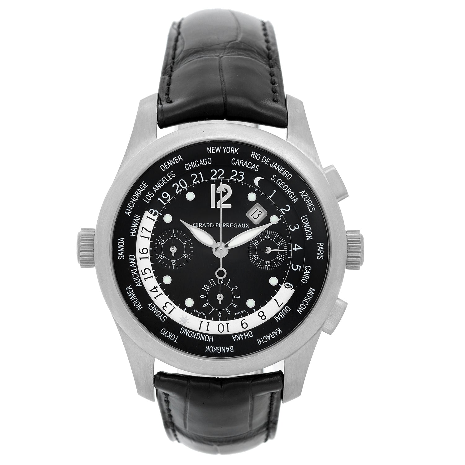 Girard-Perregaux World Time Titanium Ref 49800 - Automatic ; Water Resistant 50m. Titanium case ( 43 mm ). Black dial with luminous hour markers; Hours - Minutes - Seconds - Date - Chronograph - World Time Display - Exhibition Case Back. Black Girard-Perregaux Strap with Girard-Perregaux Titanium Tang Buckle. Recently fully serviced by Girard-Prregaux. Pre-owned with Girard-Perregaux box & papers.