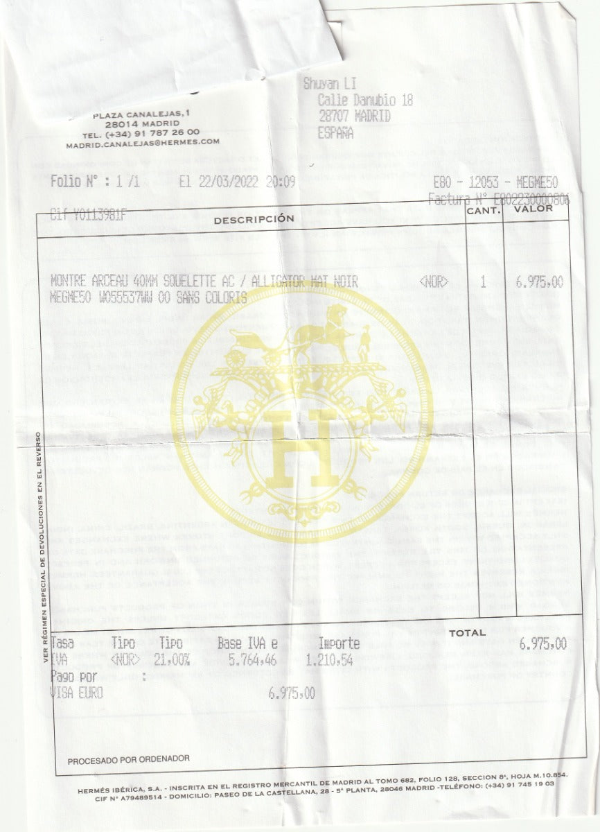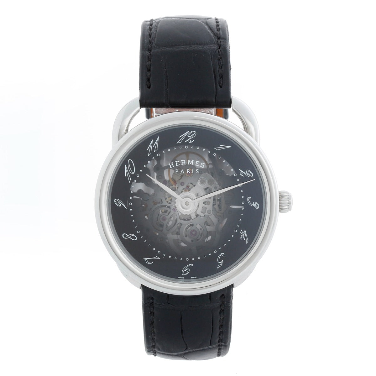 Hermes Arceau Skerret Automatic TGM 40mm Mens Watch AR2.710 - Automatic. Stainless steel with smooth bezel with a exposition caseback (40 mm). Skeleton dial with black outer ring. Matte black alligator leather strap with a deployant clasp.. Pre-owned Hermes box and original sales receipt