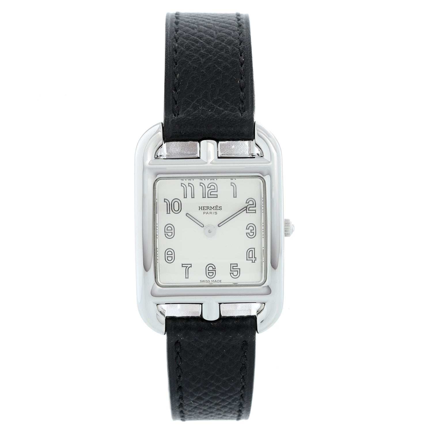 Hermes Cape Cod Stainless Steel Ladies Watch - Quartz. Stainless Steel ( 23 x 34 mm ). Silver dial with Arabic numerals. Black alligator strap. Pre-owned with custom box and papers.