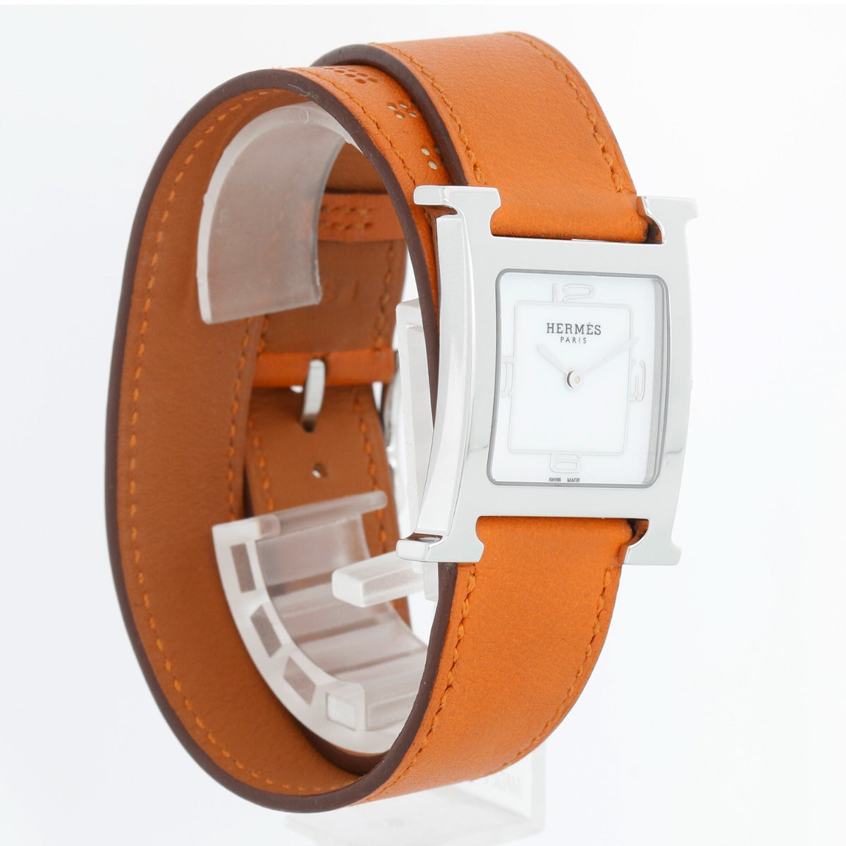 Hermes Stainless Steel Heure H Ladies Watch HH1.510 - Quartz. Stainless Steel H case ( 25 x 35 mm ) . White dial with Arabic numerals . Hermes leather wrap around strap with Hermes buckle. Pre-owned with Hermes box