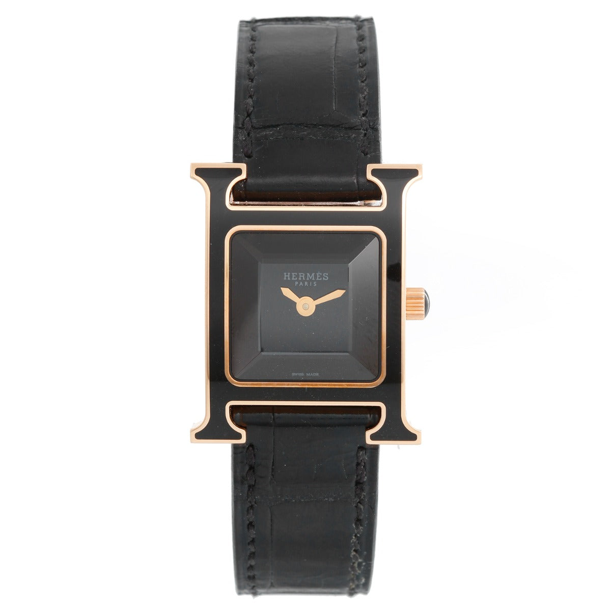 Hermes Heure H 18k Rose Gold Ladies Watch HH1.2706 - Quartz. 18K rose gold ( 25 x 30 mm ). Black dial with faceted crystal . Black alligator strap with tang buckle. Pre-owned with Hermes box and papers .