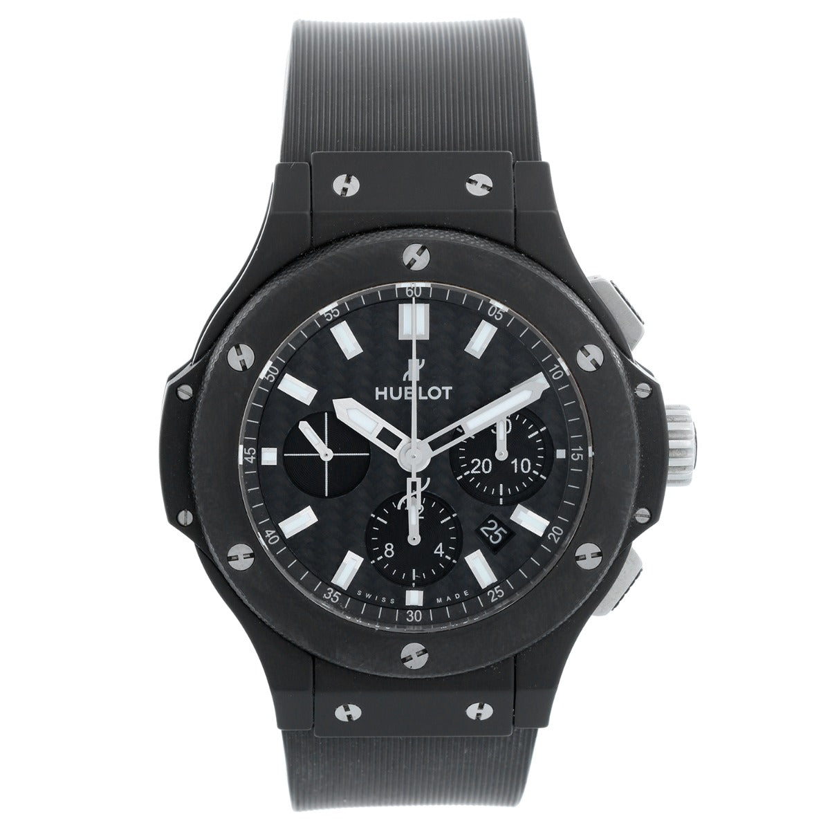 Hublot Big Bang Chronograph Men's Steel Sport Watch 301.CI.1770.RX - Automatic winding chronograph. Black brushed ceramic case & ceramic bezel and exposition back (44mm diameter). Black carbon fiber dial with baton markers, date between 4 & 5 o'clock . Black rubber strap band with stainless steel Hublot deployant clasp. Pre-owned with box and warranty card.