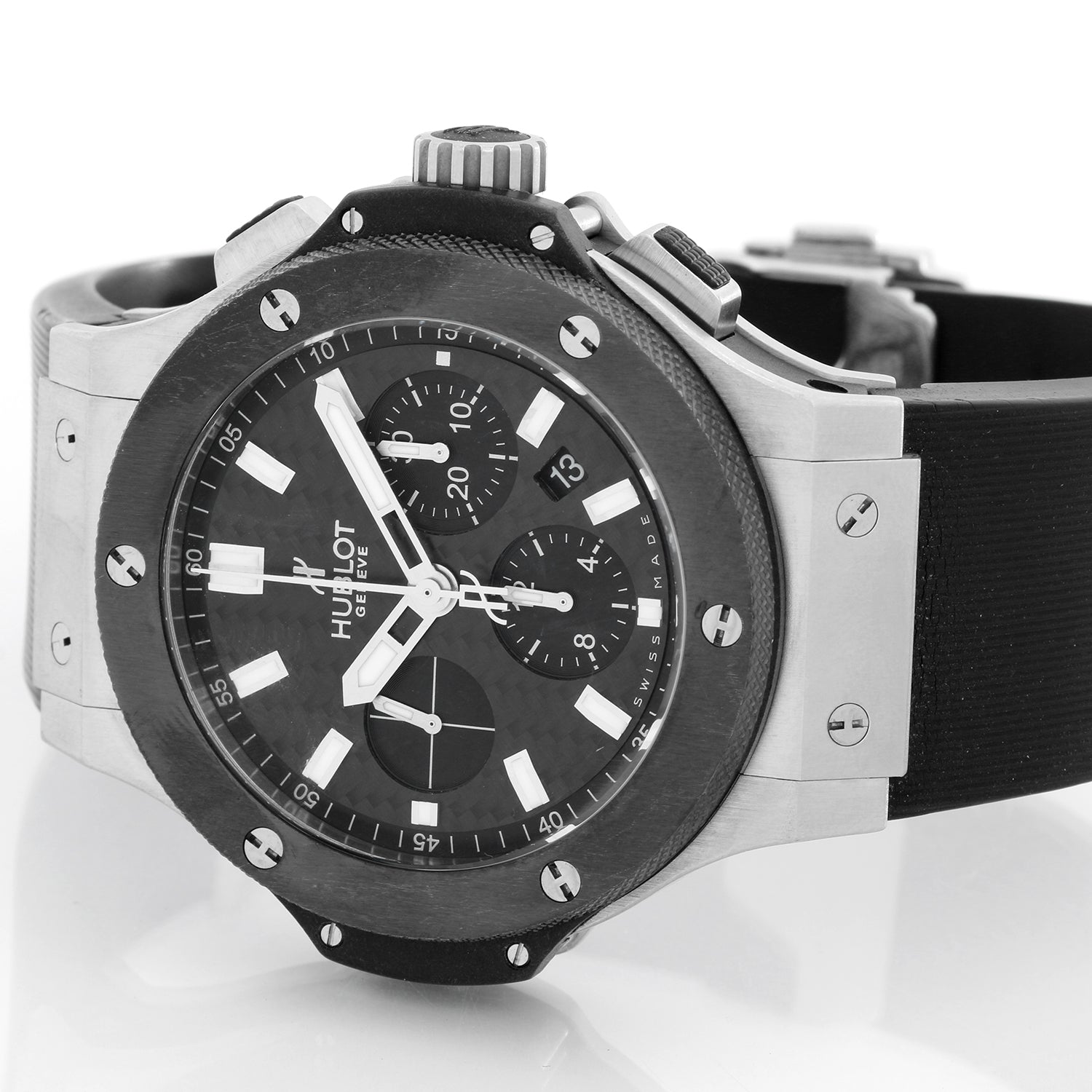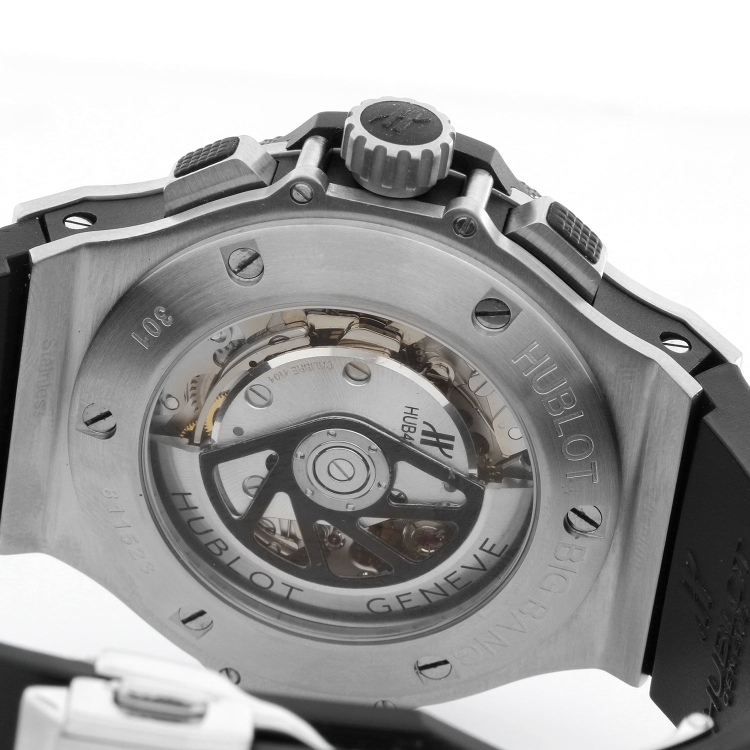 Hublot Big Bang Chronograph Men's Steel Sport Watch 301.SM.1770.RX - Automatic winding chronograph. Stainless steel case with black ceramic bezel and exposition back (44mm diameter). Black dial with baton markers, date between 4 & 5 o'clock; hour, minute and seconds recorders. Black rubber strap band with stainless steel Hublot deployant clasp. Pre-owned with box and warranty card. Current model. .