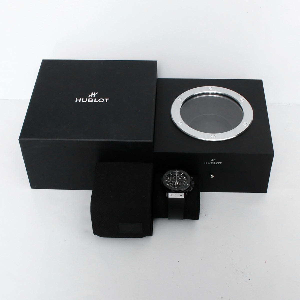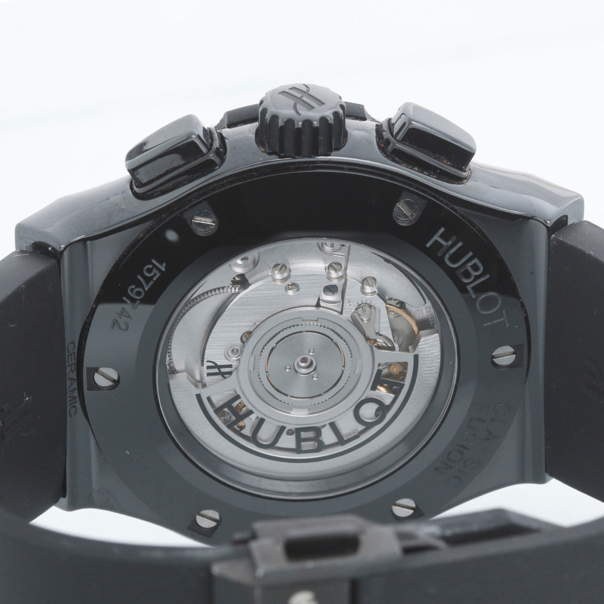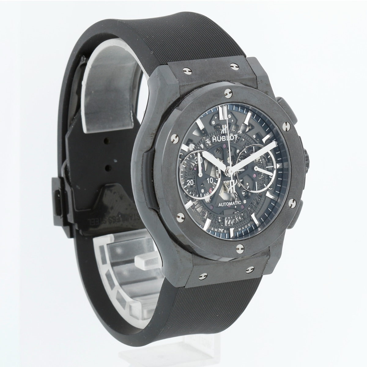 Hublot Classic Fusion Aerofusion Black Magic Chronograph Automatic Men's Watch 525.CM.0170.RX - Automatic winding chronograph. Polished and Satin-finished Black Ceramic, Satin-finished and Polished Black Ceramic Bezel with 6 H-shaped Titanium Screws (45 mm). Skeleton Dial with subdials at 3 and 9 o'clock.. Black Lined Rubber Strap with deployant clasp. Pre-owned with Hublot box.