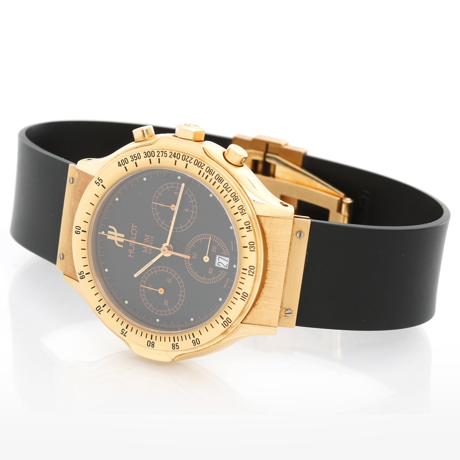 Hublot MDM Geneve Chronograph Men's Watch 1621.8 - Automatic winding. 18K Yellow gold (36mm diameter). Black dial with gold subdials; date at 6 o'clock. Black rubber strap band with gold deployant clasp; will fit up to a 7 3/4 inch wrist; will fit up to a 7 3/4 inch wrist. Pre-owned with custom box.