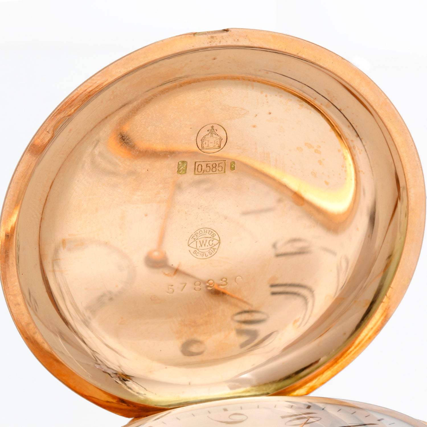 IWC 14k Gold Pocket Men's Hunting Case Antique Pocket Watch - Manual winding. 14k gold hunting case (56mm). White dial with Arabic numbers and sub second dial at 6 o'clock. Pre-owned with DeMesy box.