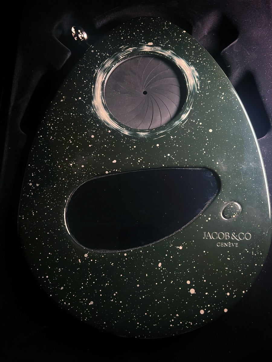 Jacob & Co. Astronomia Sky Rose Gold White Moon Men's Watch AT110.40.AA.WD.A II - Manual winding. Power Reserve : 60 Hours. Vertical Rotating Central Platform: Rotation in 20 minutes Flying Triple-Axis Tourbillon: 1st Axis: Rotation in 60 Seconds 2nd Axis: Rotation in 5 Minutes Off-centered Hour and Minute Dial with Differential Rotating, 1 ct, 288-facet, Jacob-Cut White Diamond: Rotation in 60 Seconds. Orbital Rotation in 60 Seconds Central, Day/night Indicator: Rotation in 24 hours. Rotation in 365.25 Days. Sidereal Month Indication III. 18K Rose Gold and Single-block Sapphire Case band Crystal : Curved Anti-Reflective Sapphire Crystal Caseback ( 47 mm). Titanium, Openworked Hour and Minute Dial Platform Base: Blued Titanium with Engraved and Rose Gold Inlaid Zodiac Constellations Hands : Blued, Exclusive Jacob & Co. Shape. Alligator Leather with 18K Rose Gold Deployant Clasp. Pre-owned with Jacob & Co. box and papers. Dated 11.18.21.