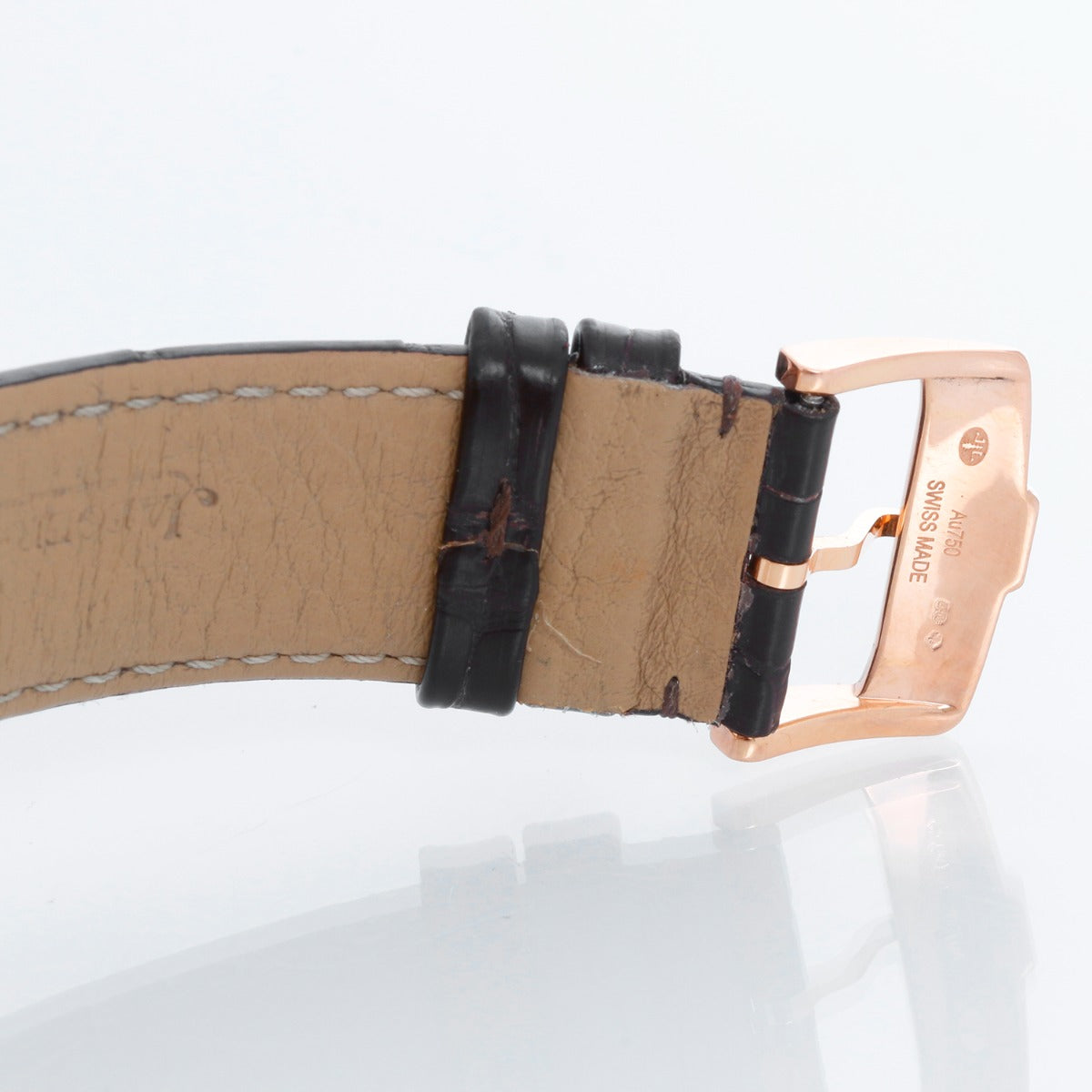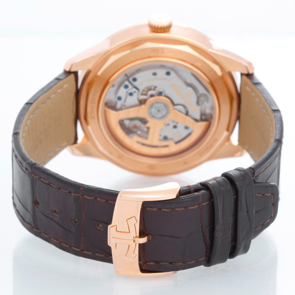Jaeger LeCoultre Geophysic Universal Time Rose Gold Men's Watch Ref Q8102520 - Automatic winding. 18K Rose gold with exposition back ( 42 mm ). Multi-color world time dial with rose gold hour markers. Dark brown alligator strap with 18K Rose gold Jaeger - Le Coultre buckle. Pre-owned with Jaeger LeCoultre box, book and warranty card. Factory warranty through 2029.