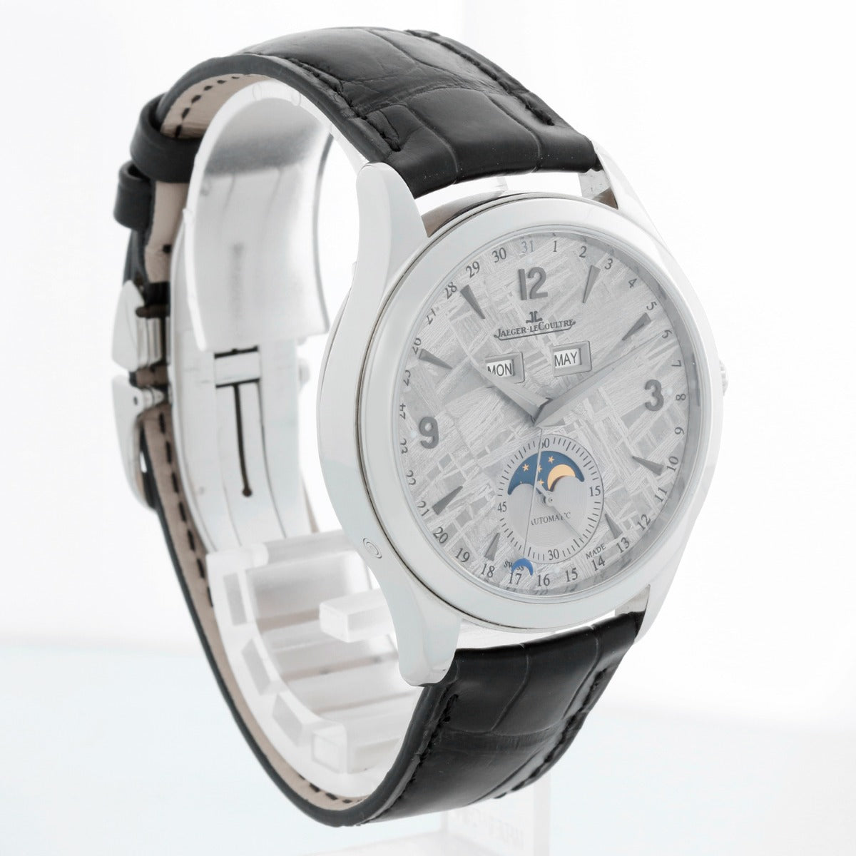 Jaeger-LeCoultre Master Calendar Men's Meteorite Stainless Steel Watch Q1558421 176.8.12.S - Automatic winding. Stainless steel case (39mm diameter). Meteorite dial with day and month indicator and date on outer edge of dial. New Jaeger strap band with stainless steel Jaeger-LeCoultre deployant clasp. Pre-owned with Jaeger Travel Box, book and papers. Dated 2017