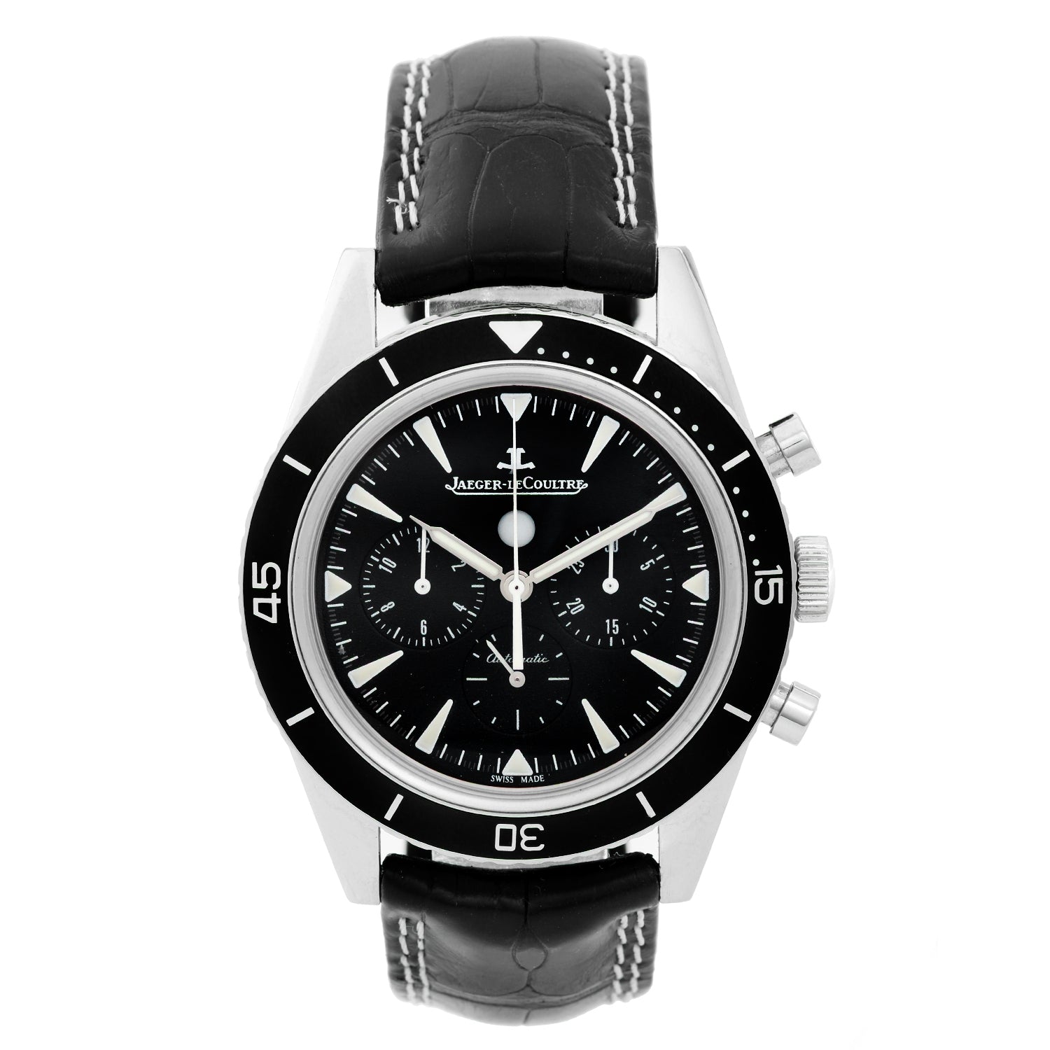 Jaeger-LeCoultre Master Deep Sea Chronograph Men's Stainless Steel Watch Q2068570 - Automatic winding chronograph. Stainless steel case. The back features a frogman and bubbles as did the motif of the 1959 model (43mm diameter). Black dial with white hour markers; hour, minute and seconds recorders. Strap with stainless steel Jaeger-LeCoultre buckle. Pre-owned with Jaeger box and book.