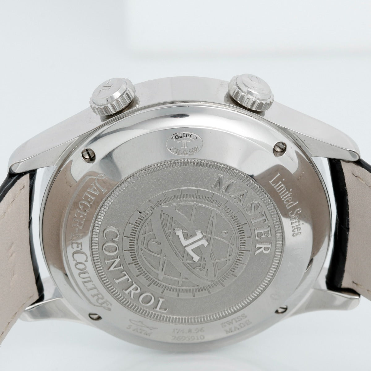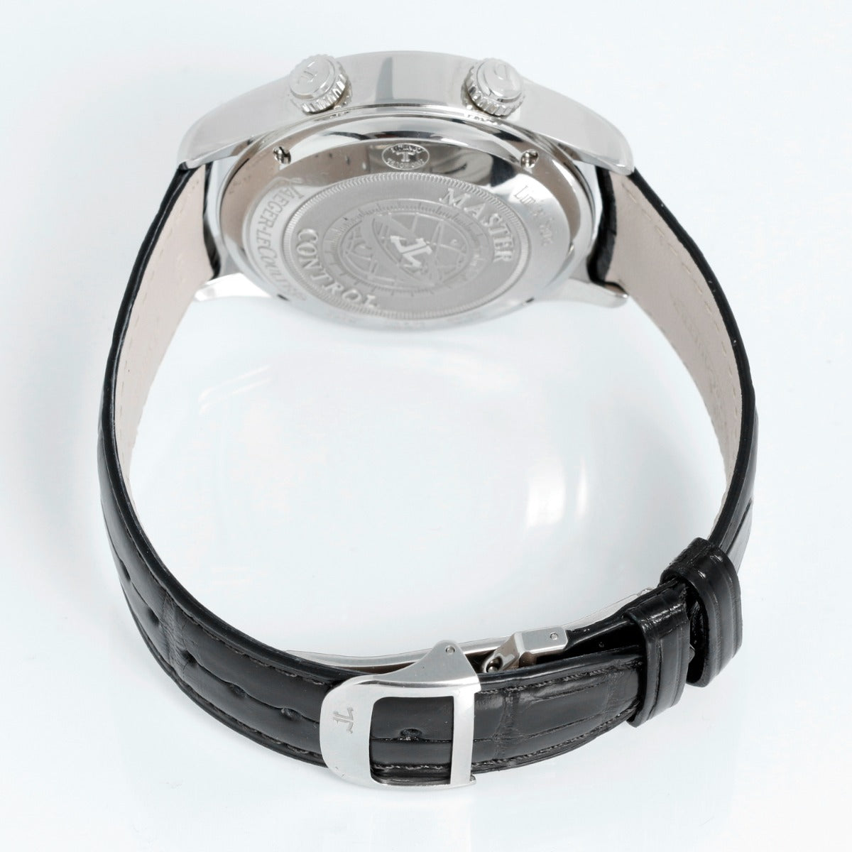 Jaeger-LeCoultre Master Memovox International Men's Watch Q1418471 - Automatic winding. Stainless steel case (40mm diameter). Black dial with silver-tone hands and index hour markers. Arabic numerals mark the 6, 9 and 12 o'clock positions. Minute markers around the outer rim. 24 international time-zones printed on the inner rotating disc. Black Jaeger Le- Coultre leather strap with Stainless steel Jaeger deployant clasp. Pre-owned with Jaeger Travel box. Limited edition 290 of 750 pieces.