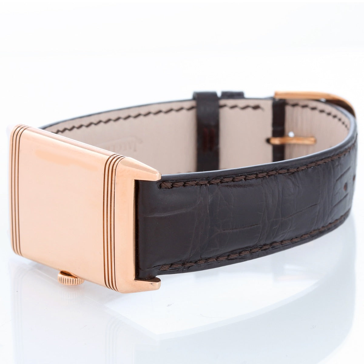 Jaeger - LeCoultre Reverso Ultra Thin Classique 18k Rose Gold Men's Watch 277.2.62 Q2782520- Manual winding. 18k rose gold Reverso case (27mm x 45mm). Silver dial with black Arabic numerals; reverses to a solid case. Brown Jaeger-LeCoultre alligator strap and 18k rose gold Jaeger-LeCoultre tang buckle. Pre-owned with Jaeger-Le Coultre box and books.