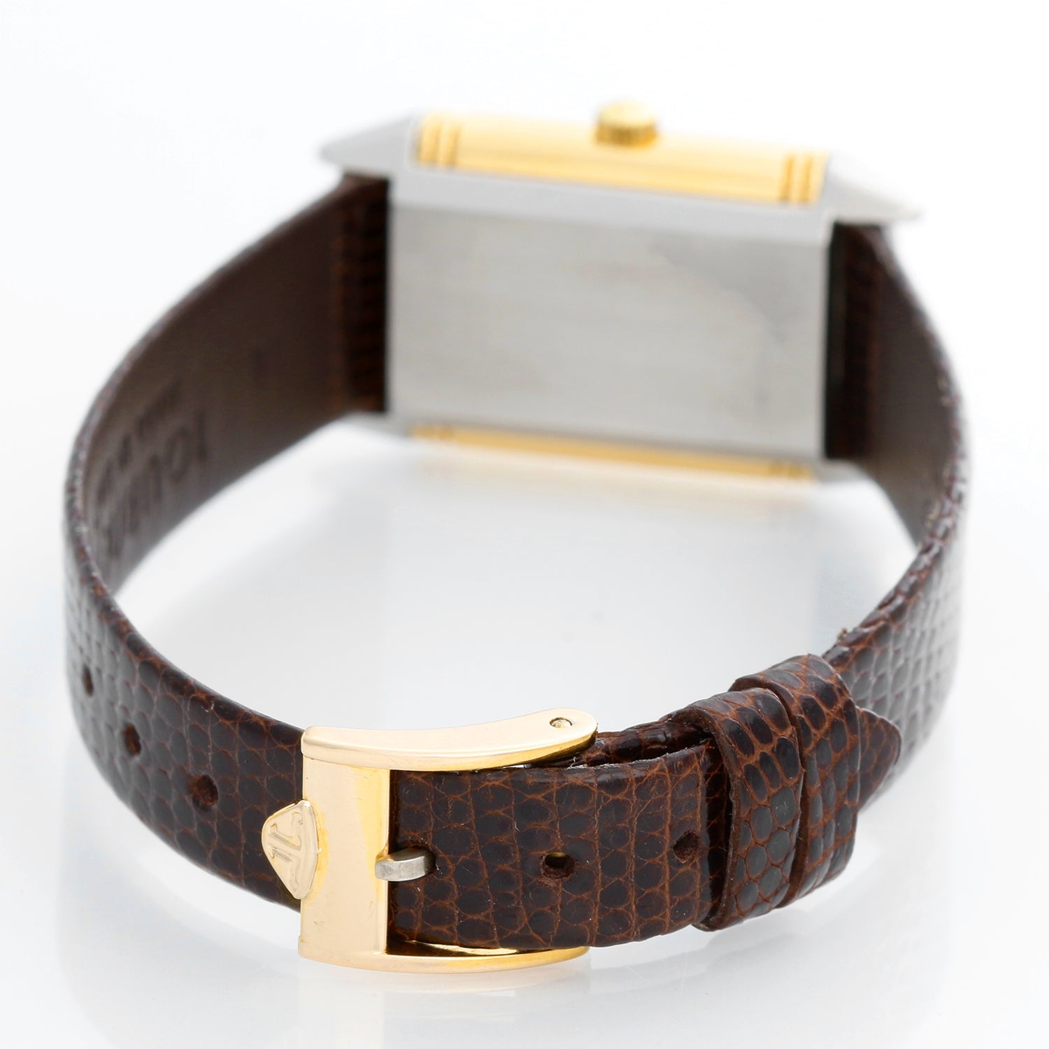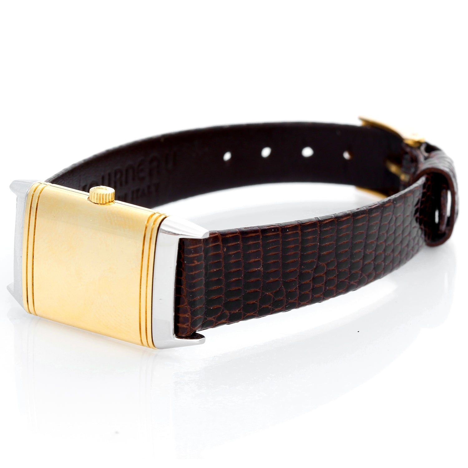 Jaeger-LeCoultre Reverso 2-Tone Ladies Watch 140.025.5 - Quartz. Stainless Steel and 18k yellow gold case reverses to solid high polished gold cover (19mm x 33mm). Silver dial with Arabic numerals . Black leather Jager Le-Coultre strap with Jager Le-Coultre 18K Yellow gold buckle . Pre-owned with custom box.