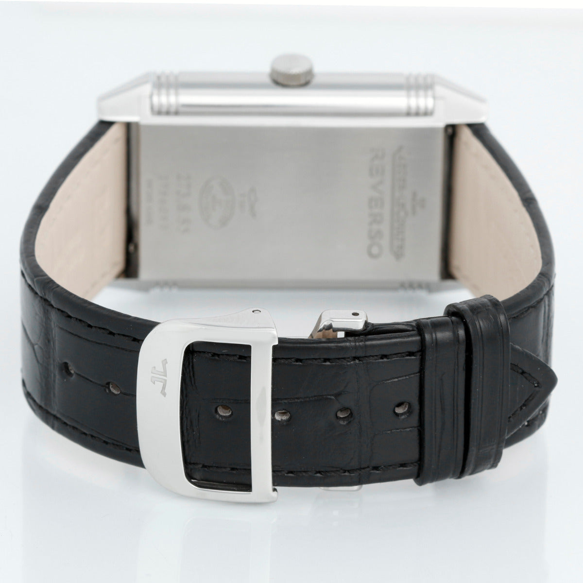 Jaeger LeCoultre Reverso Duo Q3748421 Stainless Steel watch - Manual winding. Stainless steel case with transparent caseback ( 29mm x 49mm ). Silver dial with Arabic numerals. Black JLC strap with JLC Stainless steel deployant clasp. Pre-owned with JLC travel box