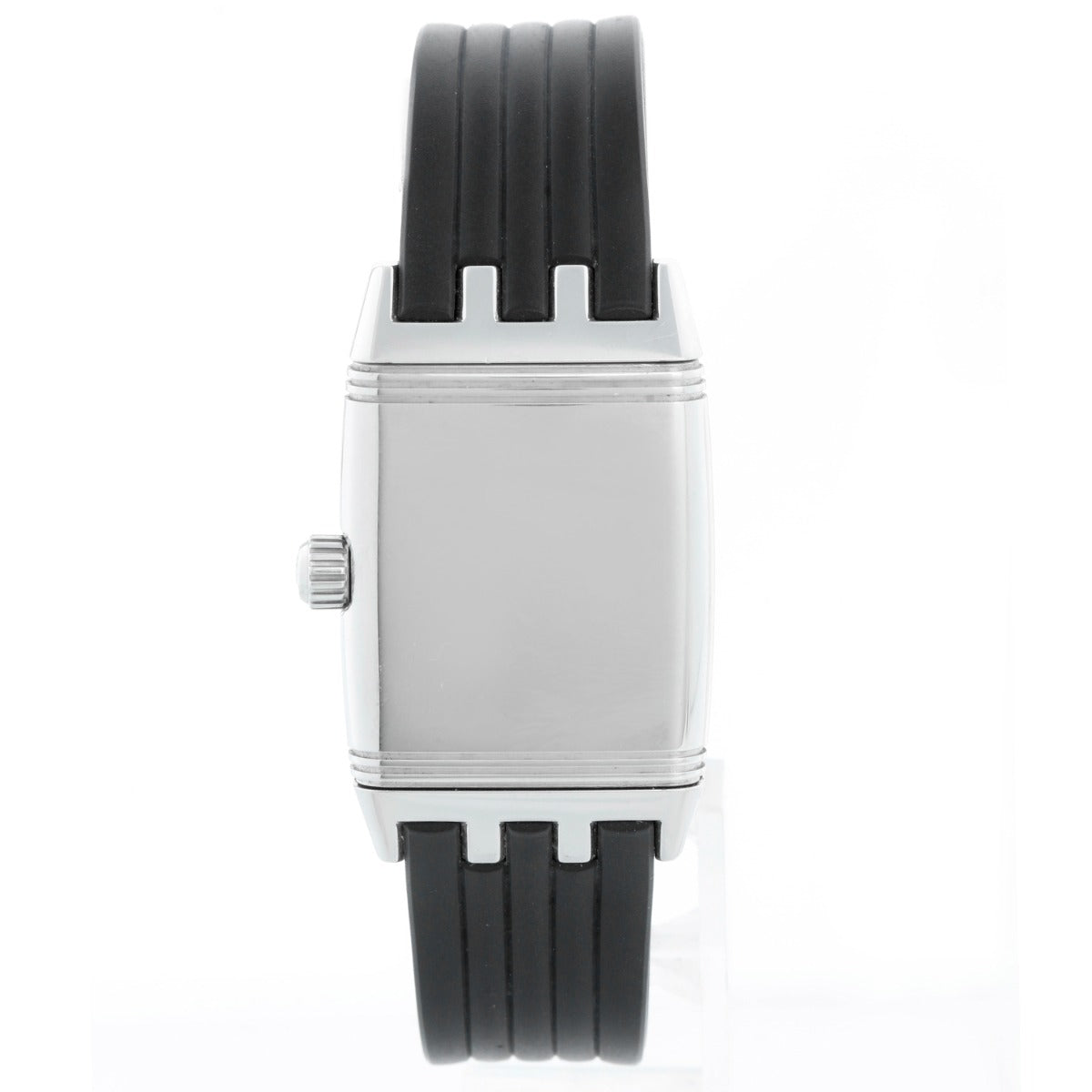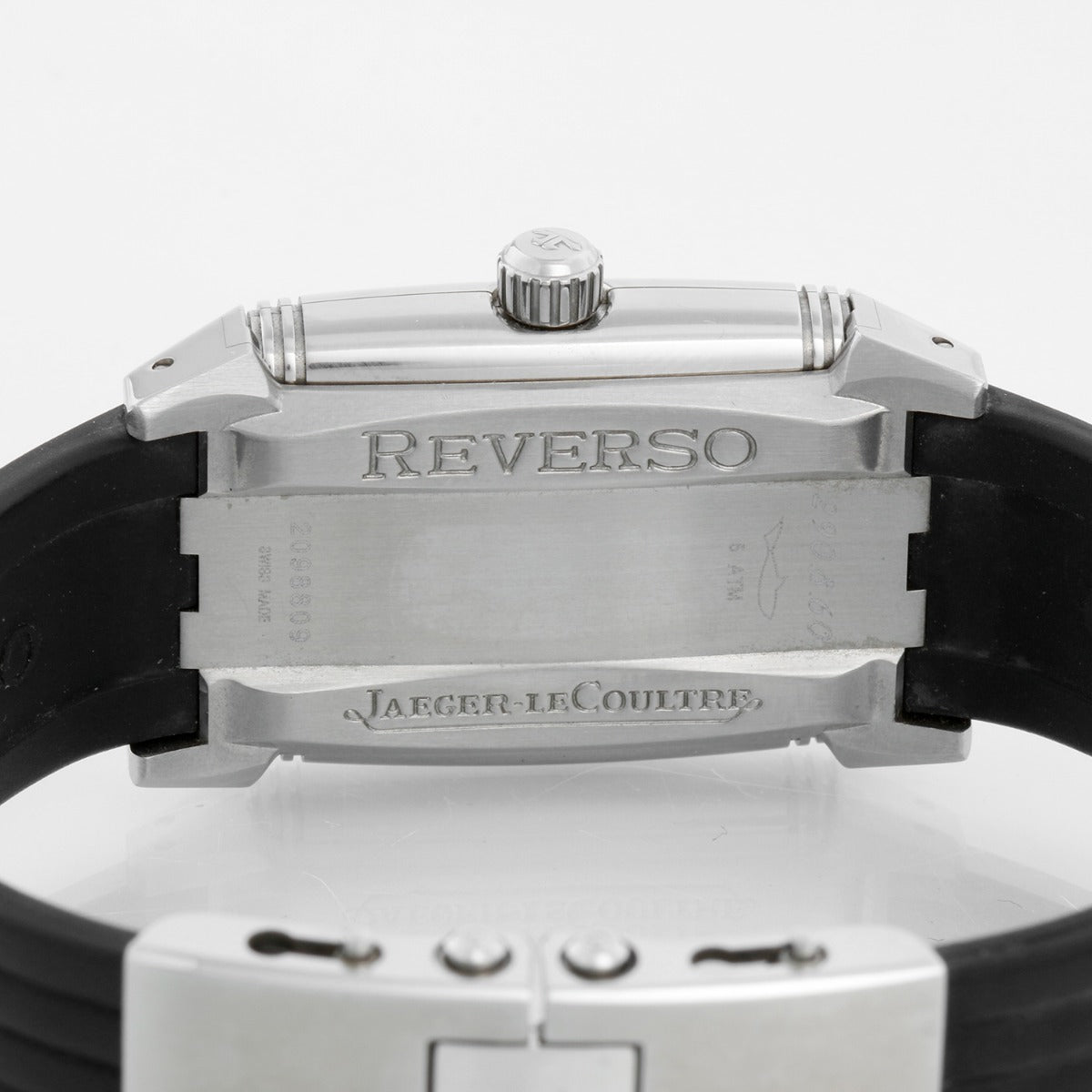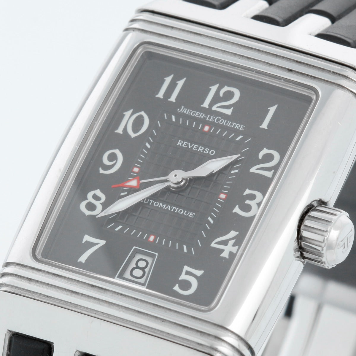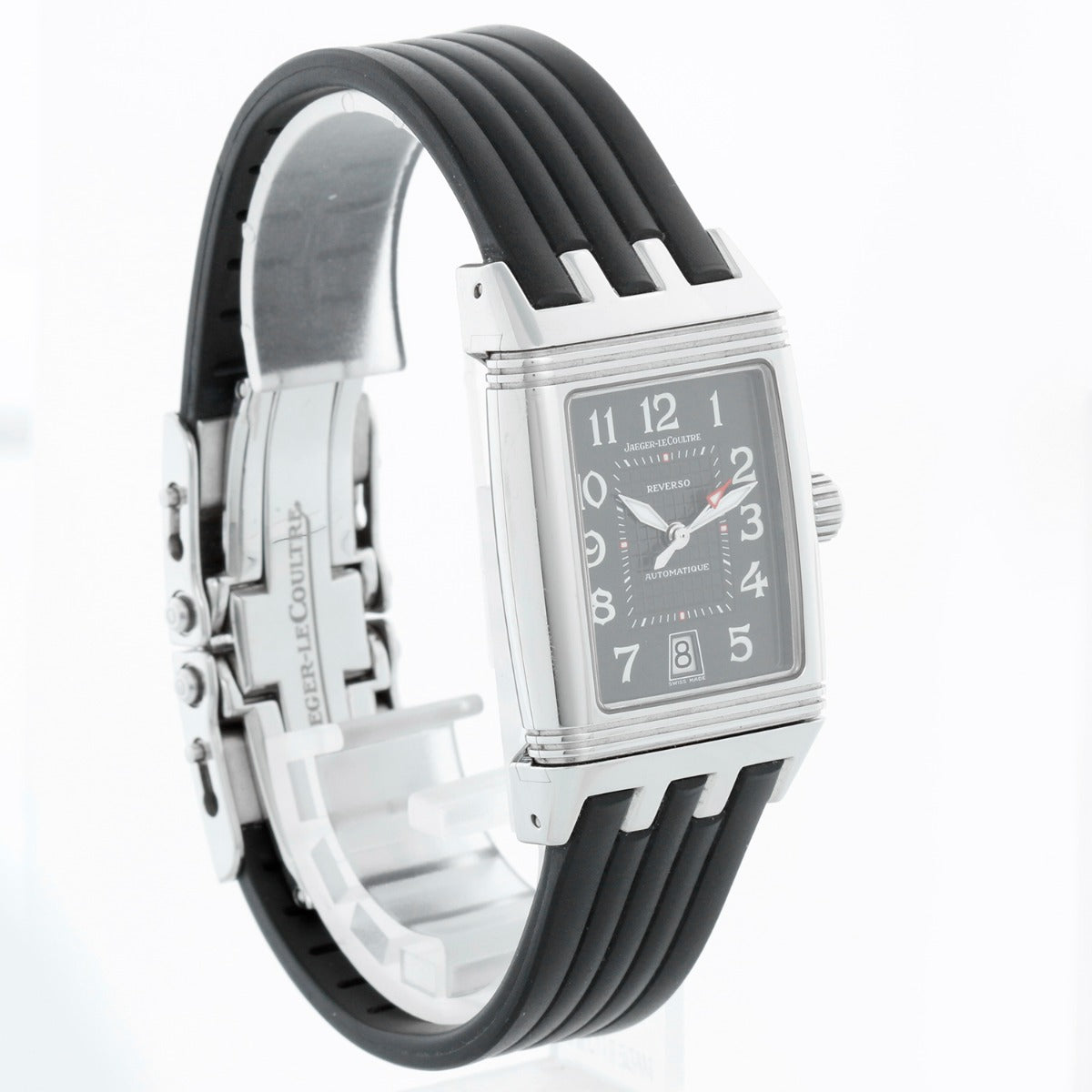 Jaeger-LeCoultre Reverso Gran Sport Men's Stainless Steel Watch 290.8.60 (or 290860) - Automatic winding. Stainless steel case reverses from solid case to black dial (25mm x 45mm). Black dial with luminous style Arabic 3 & 9; date at 6 o'clock position. Rubber bracelet with JLC deployant clasp (will fit apx. 7in. wrist). Pre-owned with custom box.