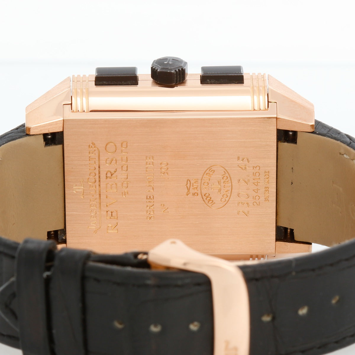 Jaeger-LeCoultre Reverso Squadra Watch 230.2.45 - Automatic movement. Rose Gold Case ( 35 x 50 mm ). Black dial with silver-toned hands and Arabic hour markers. Leather strap with a black rubber strap and 18K Rose gold deployant buckle. Pre-owned with Jaeger box and book