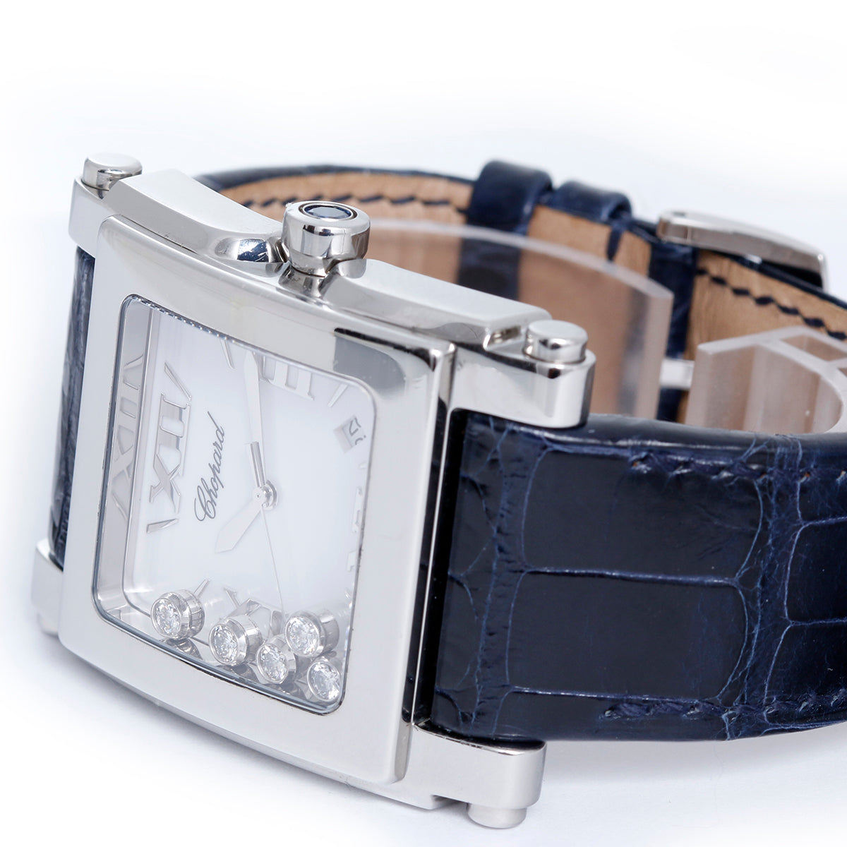 Ladies Chopard Happy Sport Diamond Watch 28/8447 - Quartz movement. Stainless steel case (35mm x 47mm). White dial with raised steel Roman numerals and stick markers; 5 floating diamonds; date between 4 and 5 o'clock. Strap band with stainless steel Chopard buckle. Pre-owned with custom box.