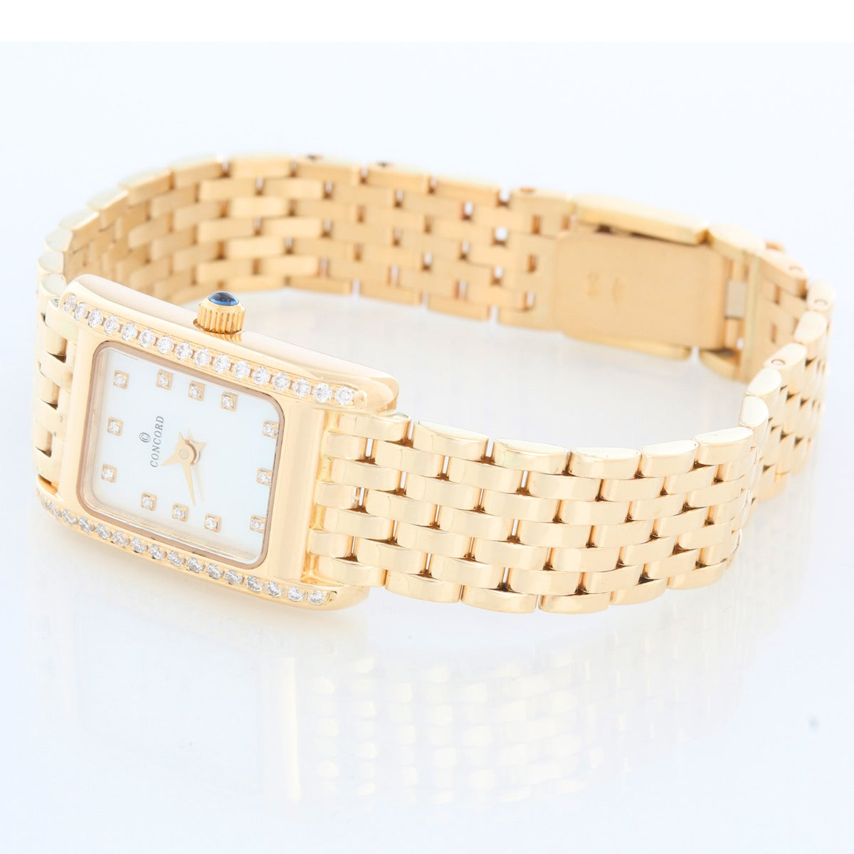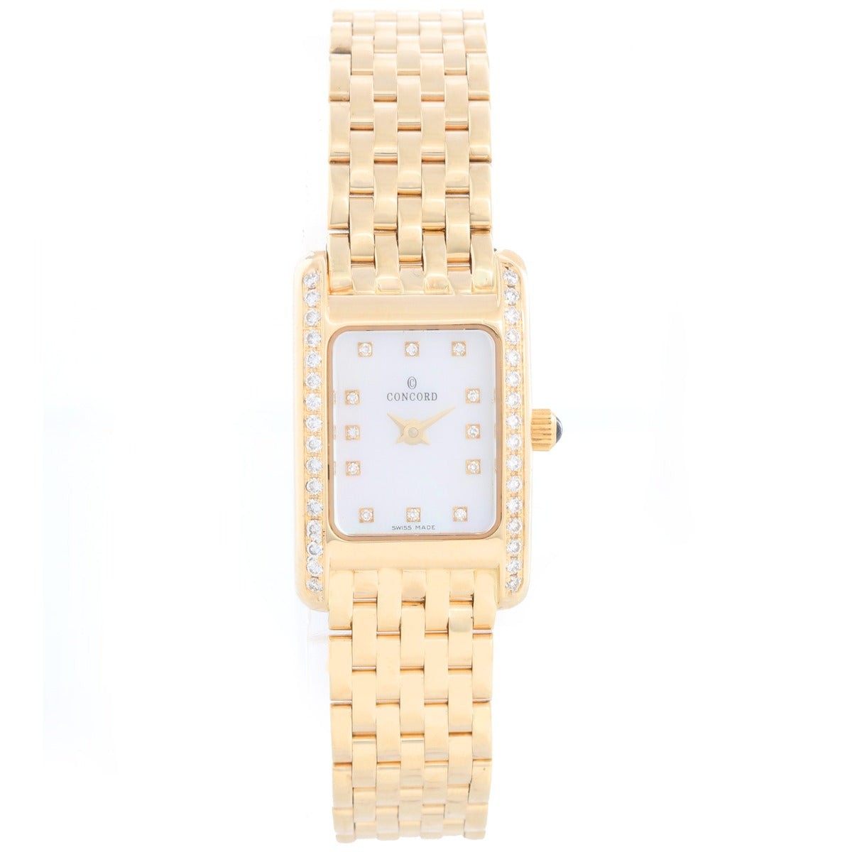 Concord 14K Yellow Gold La Tour Ladies Watch - Quartz. 18K Yellow gold case ( 17 mm ). Mother of Pearl dial with diamond hour markers. 14K Yellow gold bracelet. Will git up to a 5.75 inch wrist. Pre-owned with custom box .