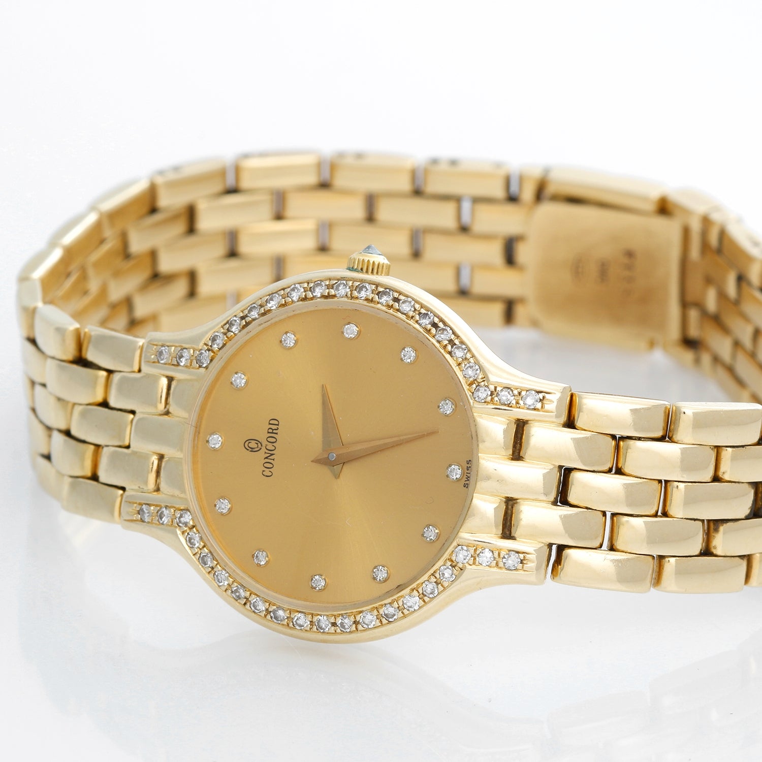 Ladies Concord Les Palais 14k Yellow Gold Watch 29-62-266 - Quartz movement. 14k yellow gold lugs and crown (25mm diameter). Champagne diamond dial. 14k yellow gold bracelet; will git a 6 7/8 inch wrist . Pre-owned with custom box .