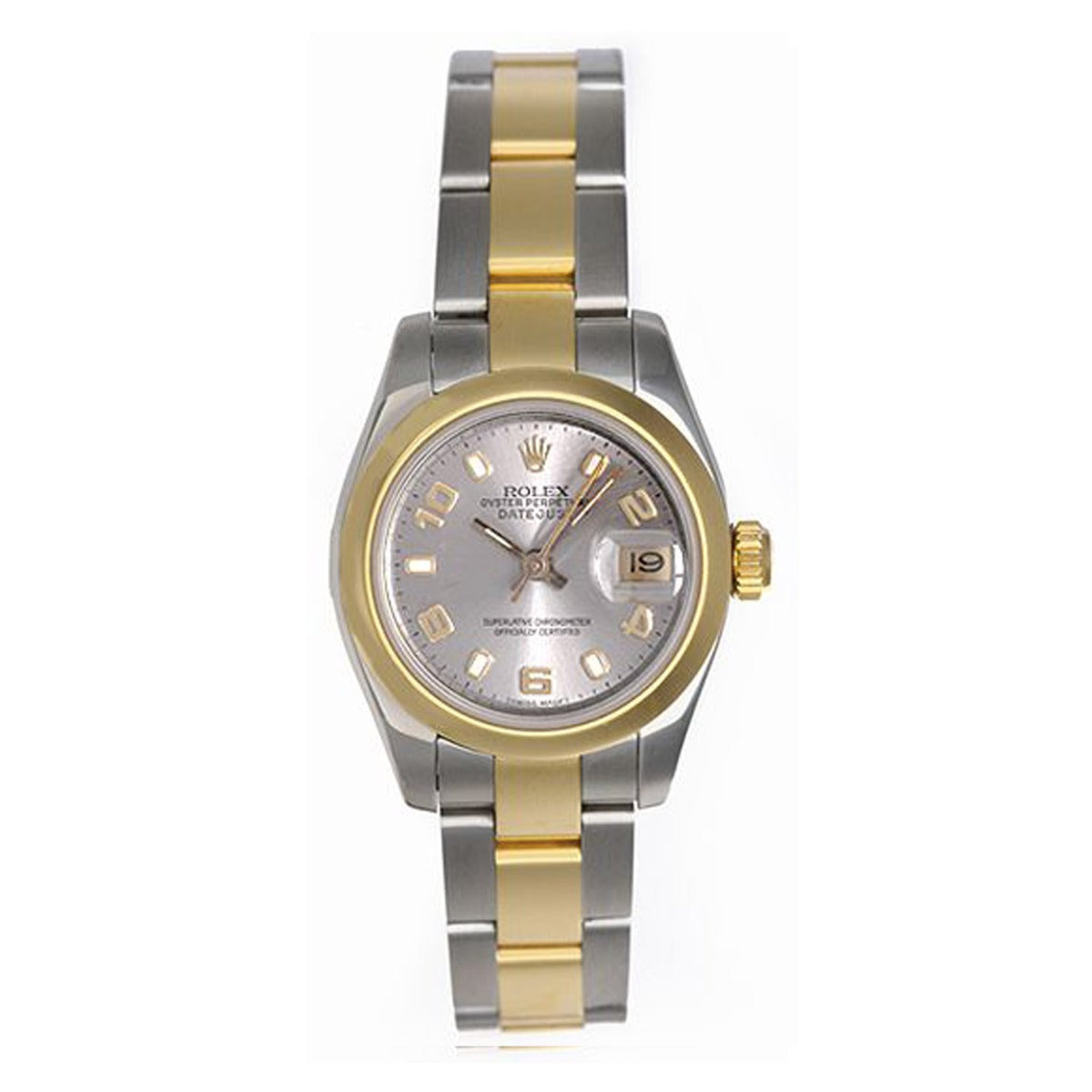 Rolex Ladies Datejust Watch 179163, Automatic winding wristwatch with date display. Stainless steel case with 18k yellow gold smooth bezel (26mm diameter). Sapphire crystal. Silver dial with Arabic numerals and luminous-type markers. Stainless steel and 18k yellow gold Rolex Oyster hidden-clasp bracelet. Pre-owned with box and books.