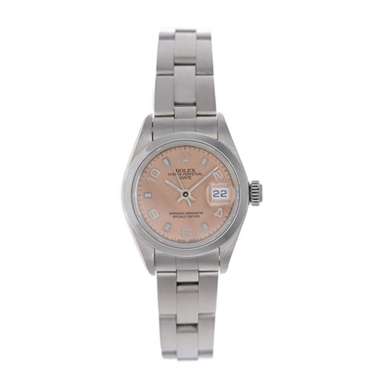 Rolex Ladies Date, Model 69160 - Automatic winding wristwatch with date. Stainless steel case with smooth bezel (26mm diameter) with smooth bezel. Rose dial with Arabic numerals and luminous markers. Stainless steel Oyster bracelet. Pre-owned with custom box.