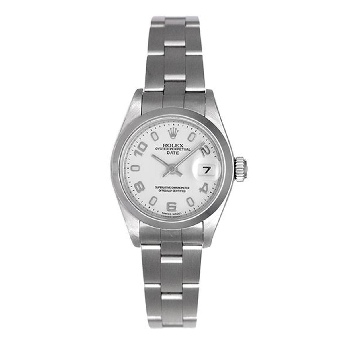 Rolex Ladies Date, Model 69160 - Ladies stainless steel round style case (26mm diameter) with smooth bezel. 31 jewel automatic-winding movement with date. White dial with raised stick markers and Arabic numerals. Stainless steel oyster bracelet. Pre-owned with custom box.