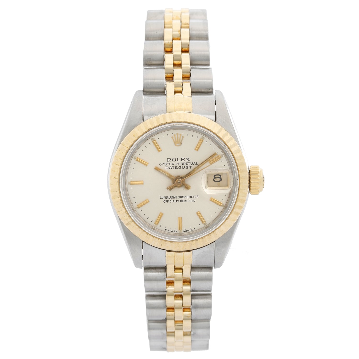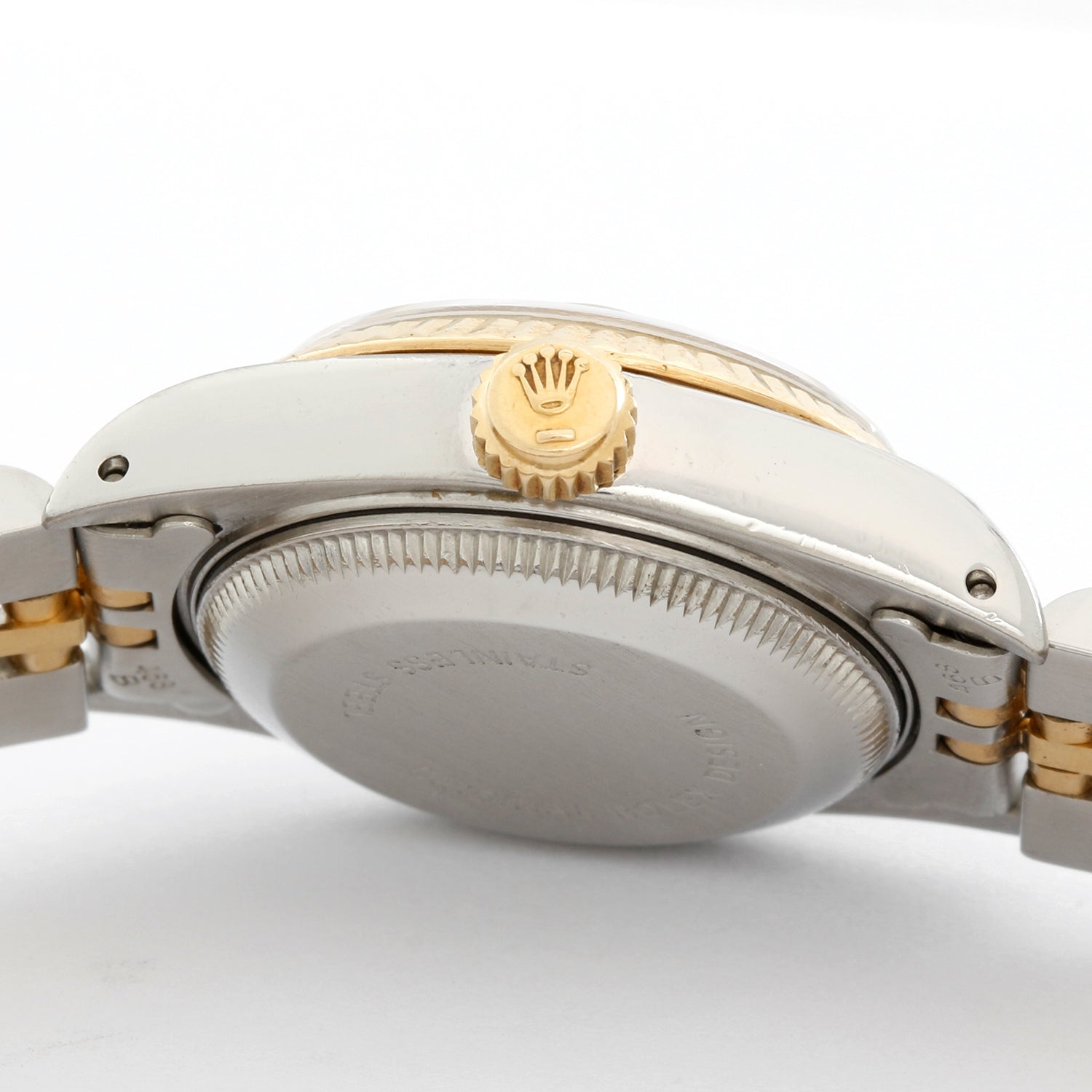 Rolex Ladies 2-Tone Datejust - 69173 - Automatic winding with date. Stainless steel case with 18k yellow gold fluted bezel (26mm diameter). Silver dial with gold stick markers. Stainless steel and 18k yellow gold Jubilee bracelet. Pre-owned with custom box.