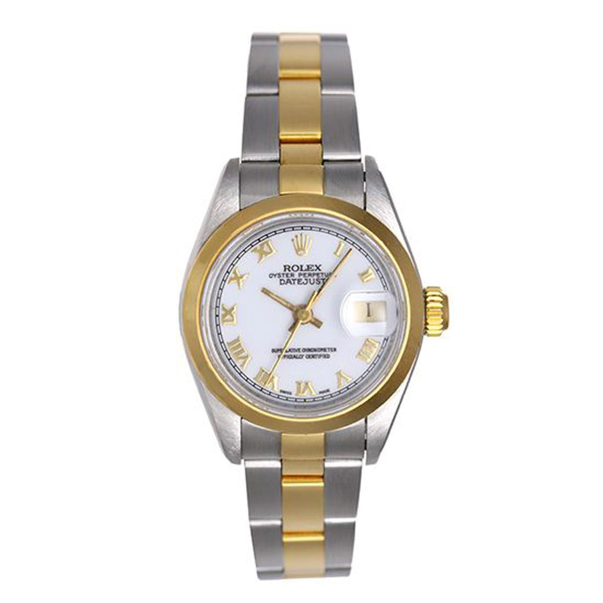 Rolex Lady Datejust 2-Tone Watch 69173 - Ladies automatic winding wristwatch. Stainless steel case with 18k yellow gold smooth bezel (26mm diameter). White dial with raised gold Roman numerals. Stainless steel and 18k yellow gold Oyster bracelet. Pre-owned with custom box.