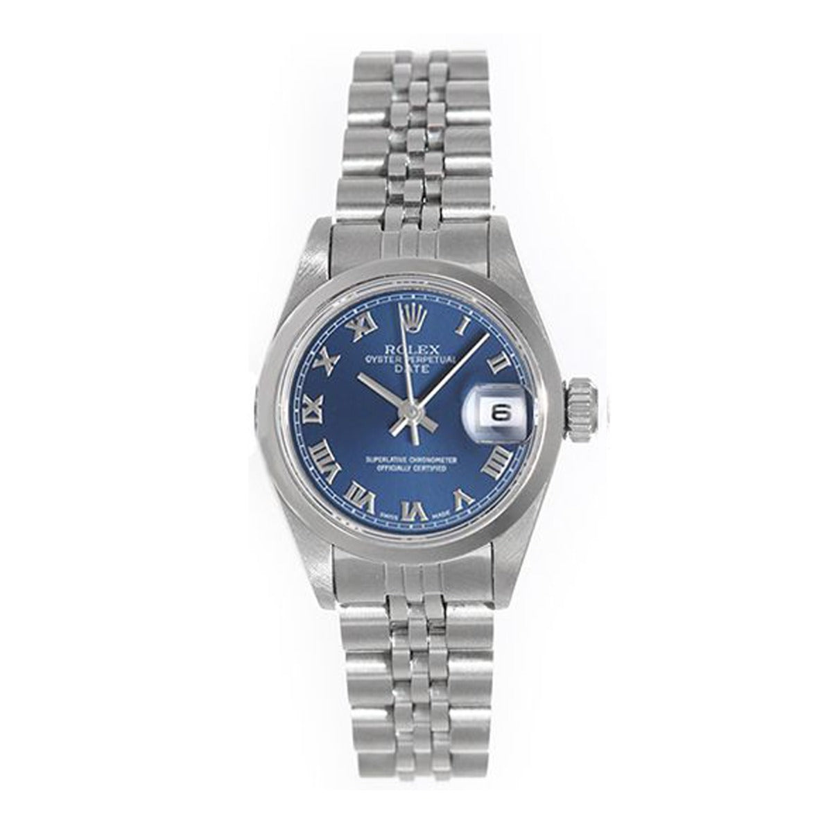 Rolex Ladies Datejust, Model 69160 - Ladies stainless steel round style case (26mm diameter) with smooth bezel. 31 jewel automatic-winding movement with date. Dark blue dial with raised Roman numerals. Stainless steel Jubilee bracelet. Pre-owned with custom box.