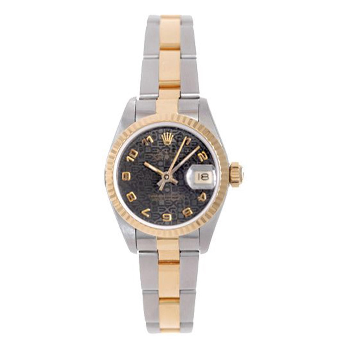 Rolex Datejust, Model 69173 - Ladies automatic winding wristwatch. Stainless steel case with 18k yellow gold fluted bezel (26mm diameter). Black Jubilee dial with gold Arabic numerals. Stainless steel and 18k yellow gold Oyster bracelet. Pre-owned with custom box.