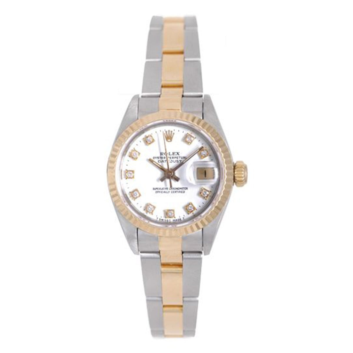 Rolex Datejust, Model 69173 - Ladies automatic winding wristwatch. Stainless steel case with 18k yellow gold fluted bezel (26mm diameter). Factory white diamond dial. Stainless steel and 18k yellow gold Oyster bracelet. Pre-owned with custom box.
