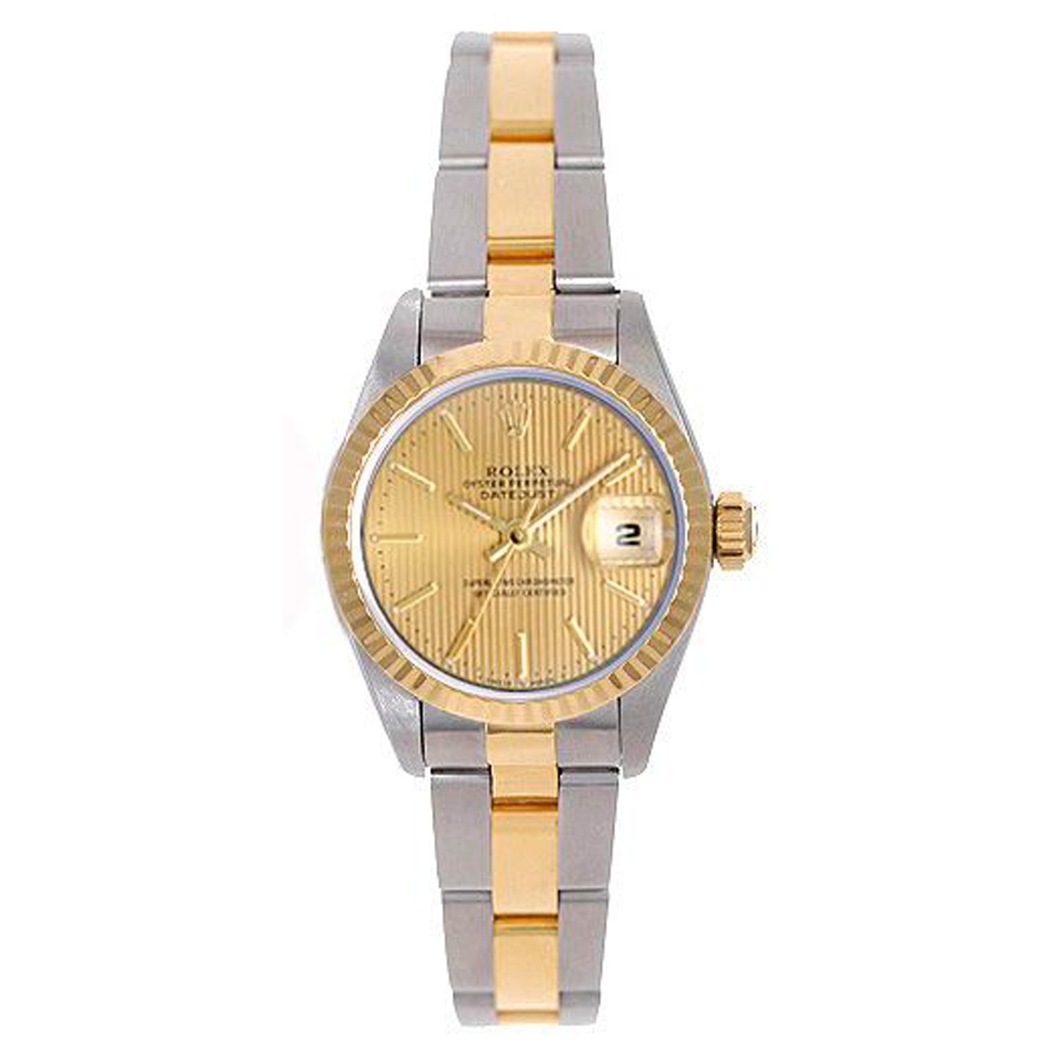 Rolex Datejust, Model 79173 - Ladies automatic winding wristwatch. Stainless steel case with 18k yellow gold fluted bezel (26mm diameter). Champagne tapestry dial with stick markers. Stainless steel and 18k yellow gold Oyster bracelet. Pre-owned with custom box.