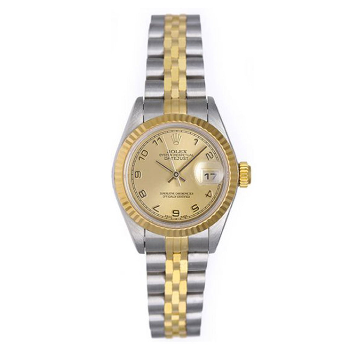 Rolex Datejust, Model 69173 Ladies stainless steel round style case (26mm diameter) with 18k yellow gold fluted bezel and winding crown. 31 jewel automatic-winding movement. Champagne dial with Arabic numerals. Stainless steel jubilee bracelet with 18k yellow gold center links. Series A. Pre-owned with custom box.