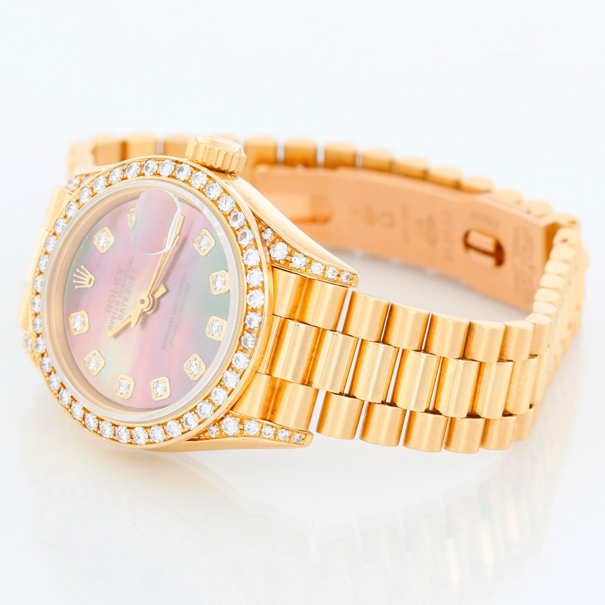 Ladies Rolex President 18k Gold & Diamond Watch 69158 - Automatic winding. 18k yellow gold case with factory diamond bezel and factory diamond lugs (26 mm) . Genuine Rolex tahitian mother of pearl diamond dial with diamond hour markers. 18k yellow gold Rolex hidden-clasp President bracelet. Pre-owned with Rolex box and books.