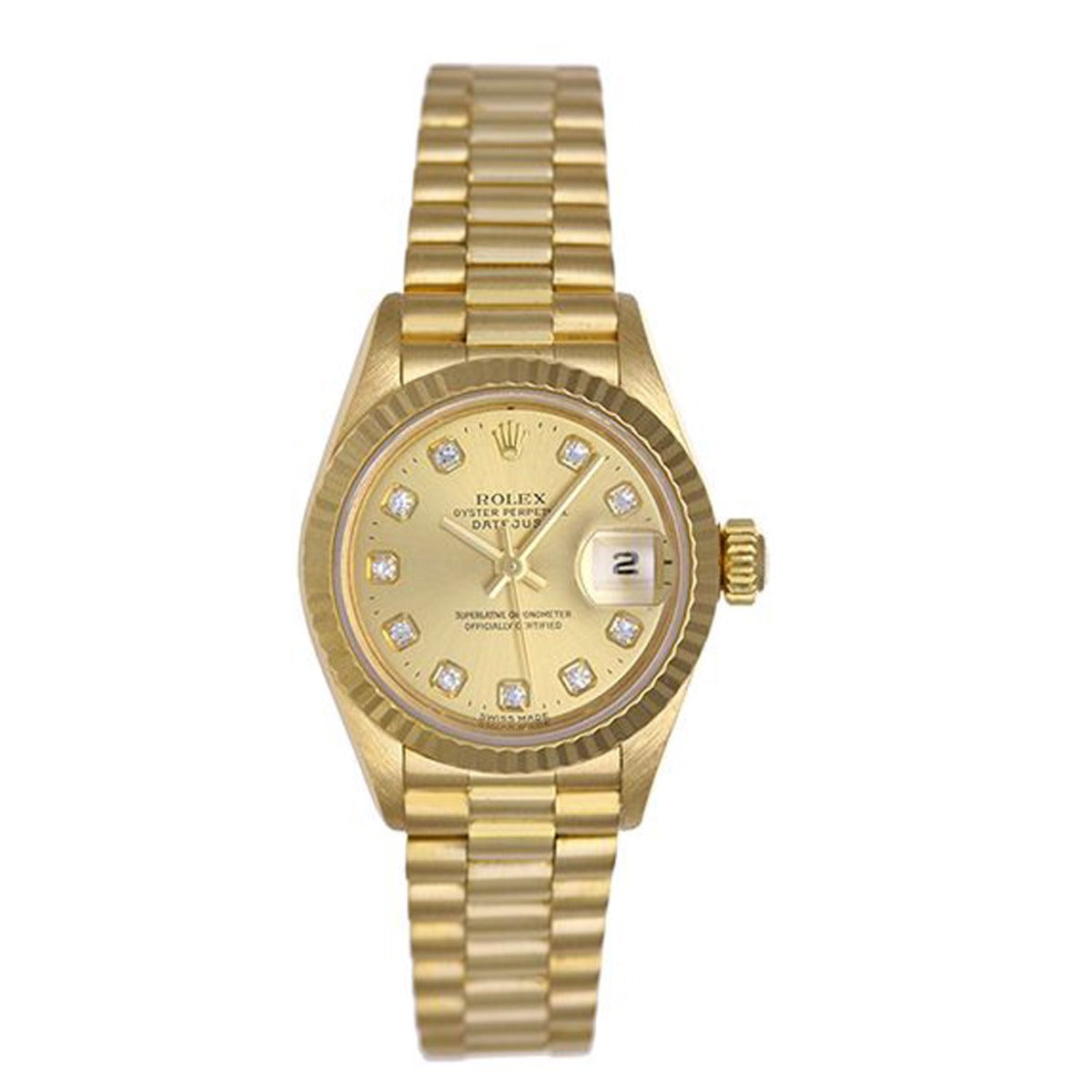 Rolex Ladies President Model 79178 - Automatic winding wristwatch . 18k yellow gold case with fluted bezel (26mm diameter). Champagne dial with factory diamond hour markers. 18k yellow gold hidden-clasp President bracelet. Pre-owned with Rolex box and books.