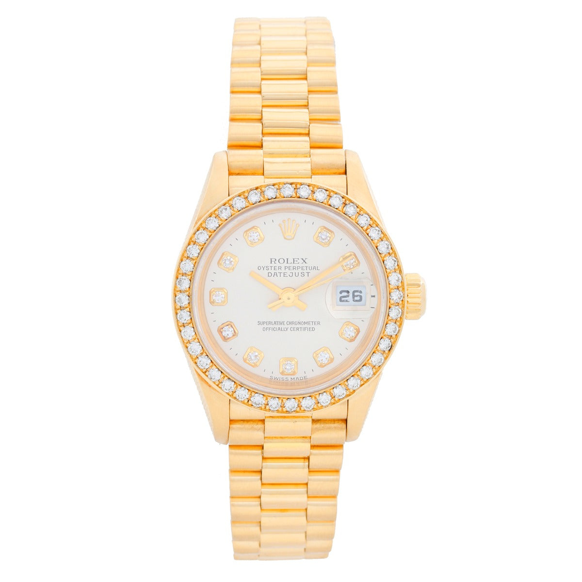 Ladies Rolex President 18k Yellow Gold Diamond Watch 79138 - Automatic winding, 31 jewels, Quickset date, sapphire crystal. 18k yellow gold case with factory diamond bezel 26 mm) . silver dial with factory diamond hour markers. 18k yellow gold Rolex hidden-clasp President bracelet. Pre-owned with box and books.
