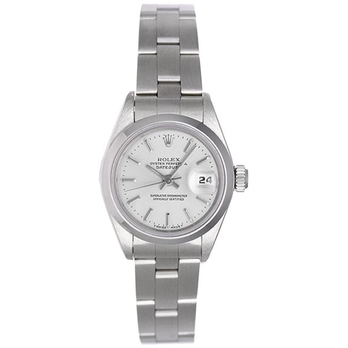 Rolex Ladies Date, Model 79160 - Ladies automatic winding wristwatch. Stainless steel round style case with smooth bezel (26mm diameter). Silver dial with stick markers. Stainless steel Oyster bracelet. Pre-owned with custom box.