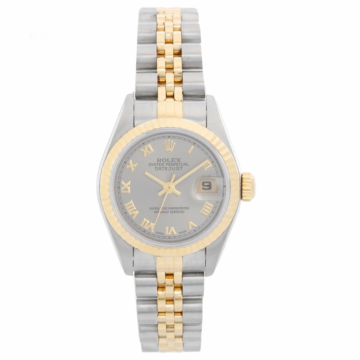 Rolex Datejust, Model 79173 - Ladies stainless steel round style case (26mm diameter) with 18k yellow gold fluted bezel and winding crown. 31 jewel automatic-winding movement. Gray dial with Roman numerals. Stainless steel Jubilee bracelet with 18k yellow gold center links. Pre-owned with custom box.