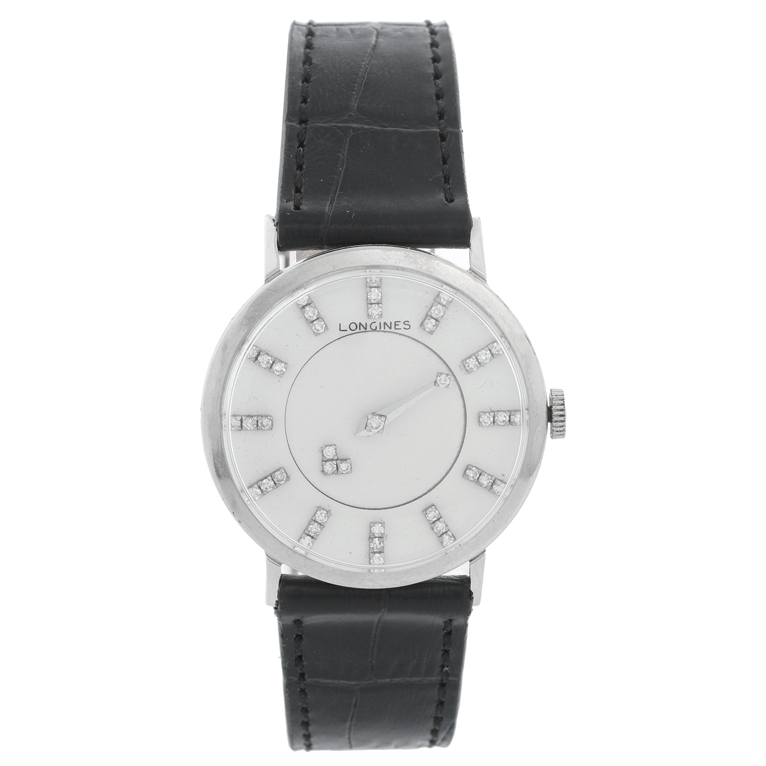 Longines 14K White Gold 1950's Mystery Dial Watch - Manual winding. 14K White Gold ( 32 mm ). Silver tone with three diamond rotating disk for hours and 3 diamonds at the six o'clock mark. Two diamonds on minute hands. Black strap band with tang buckle. Pre-owned with custom box.