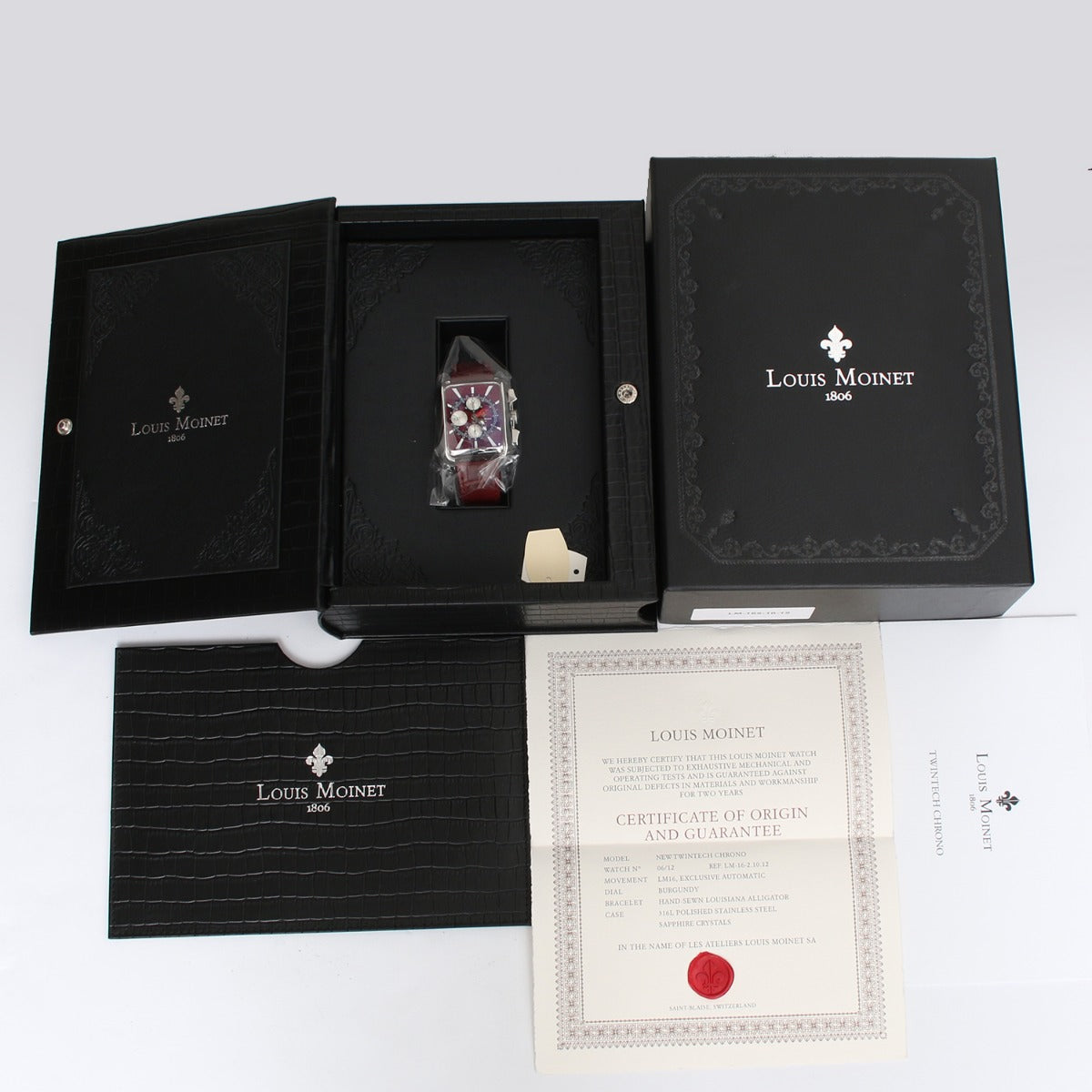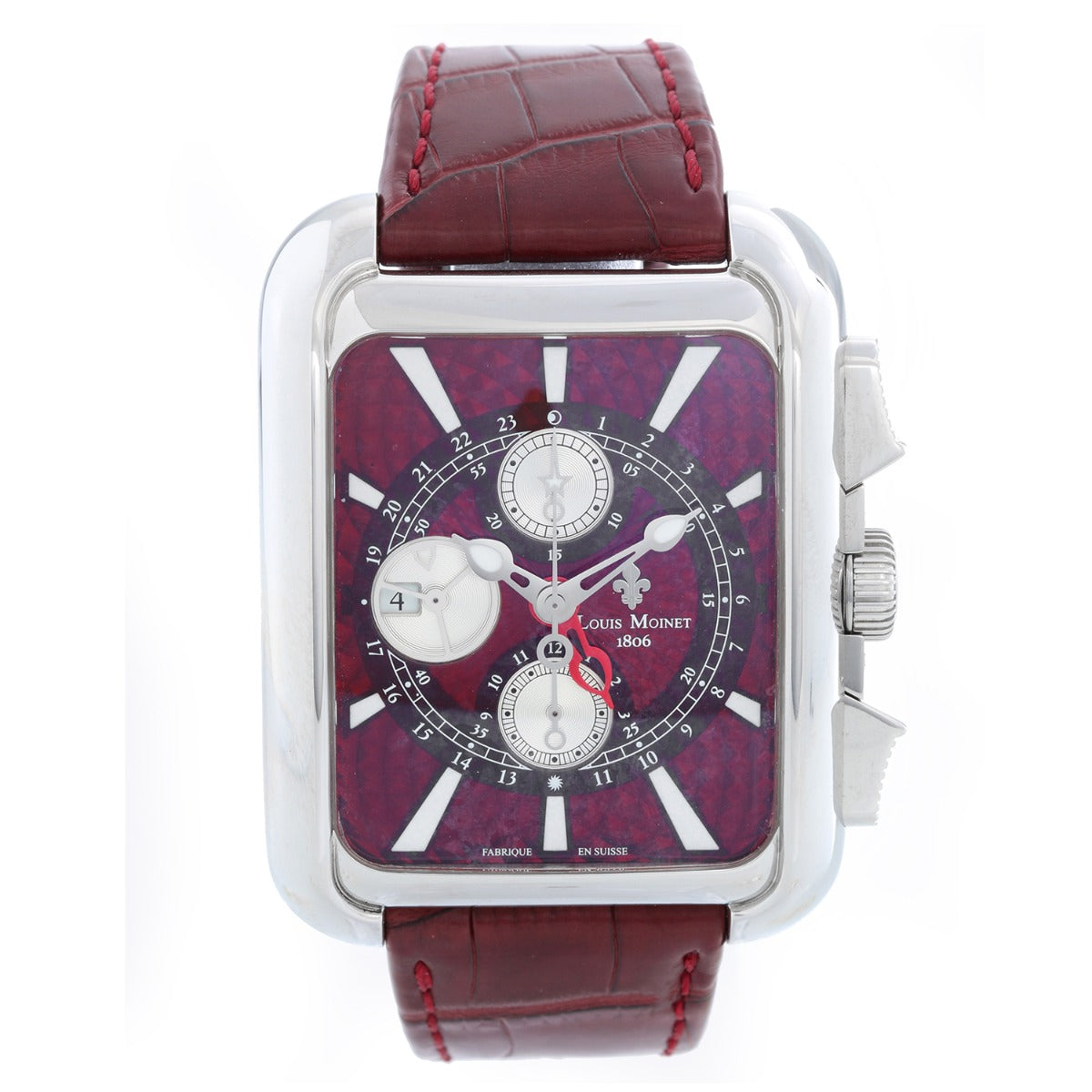 Louis Moinet Men's 40mm Twintech Automatic GMT Men's Watch LM.162.10.12 - Automatic winding. Stainless steel ( 40 mm ) . Red hollogramed dial with 3 subdials; GMT function, date at 9 o'clock . Burgundy leather strap with Louis Moinet Deployant clasp . Pre-owned with Box and card.